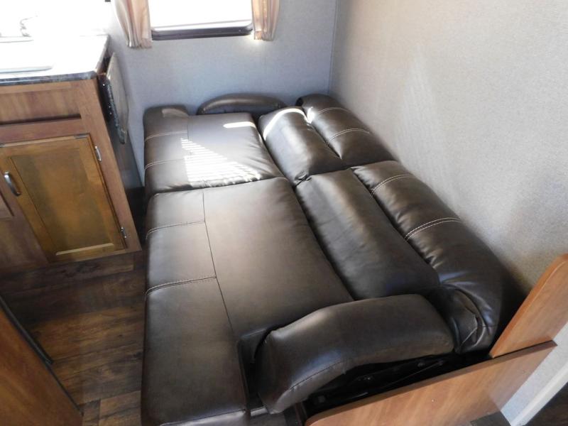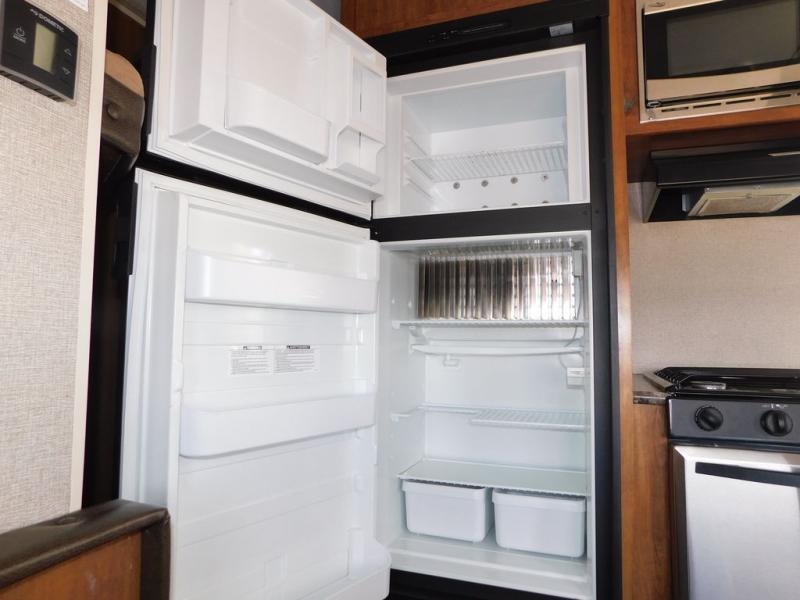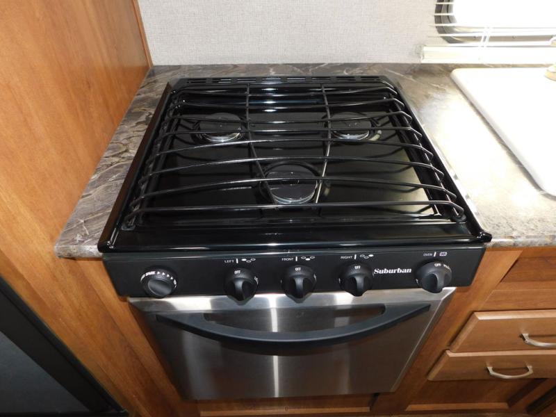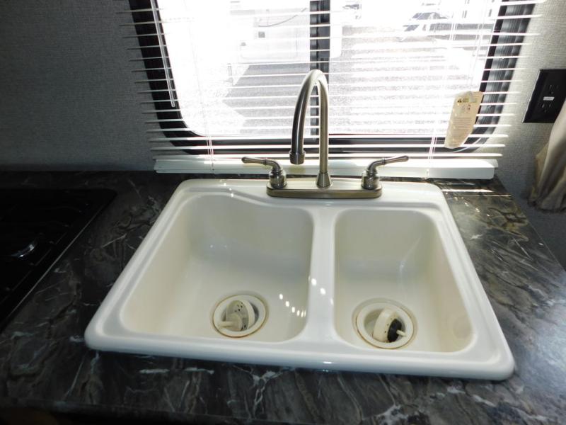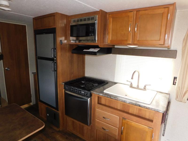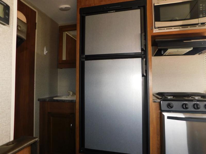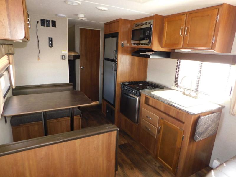 There is a booth dinette to the left of the main entry for dining. There is also storage above for your things. Opposite find a large kitchen sink for cleaning up easily, a three burner range, refrigerator, and overhead cabinets for your dry good storage and dishes.
