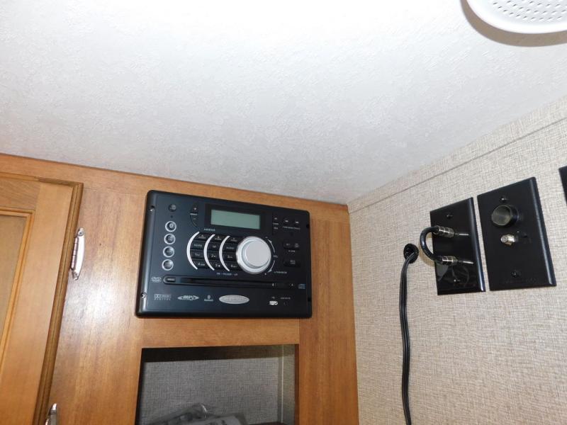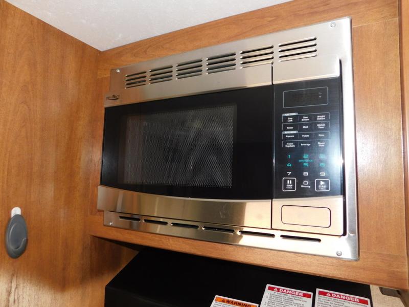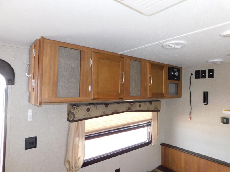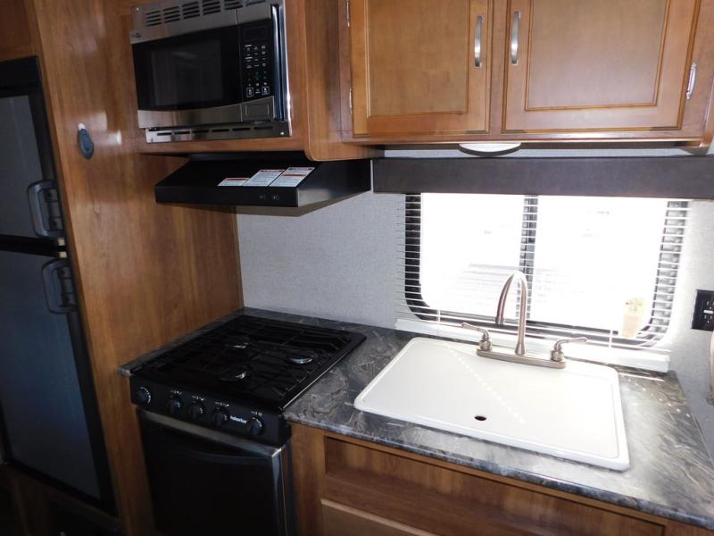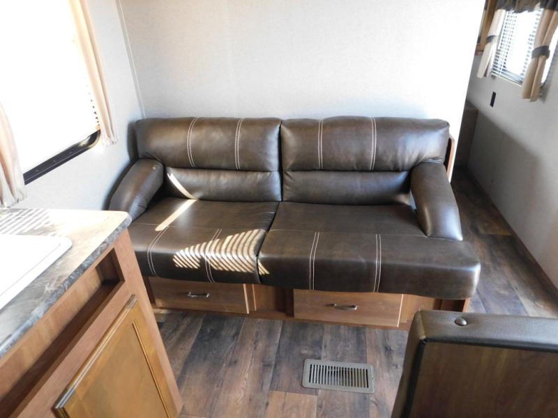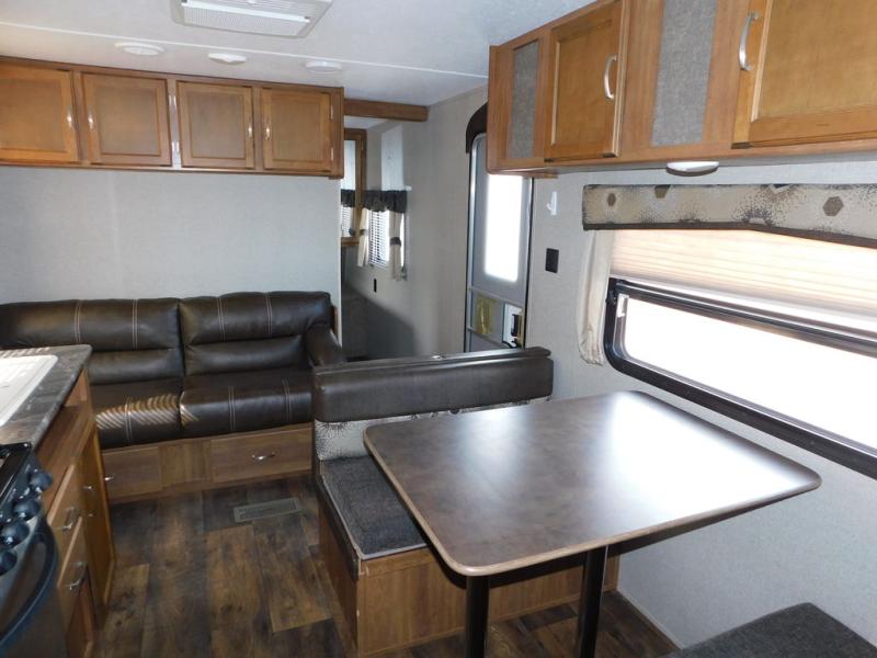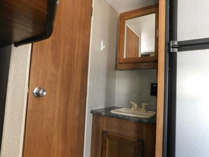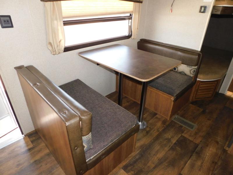 There is a booth dinette to the left of the main entry for dining. There is also storage above for your things. Opposite find a large kitchen sink for cleaning up easily, a three burner range, refrigerator, and overhead cabinets for your dry good storage and dishes.
