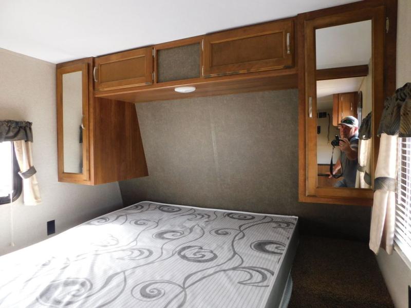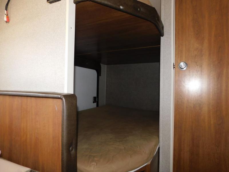 As you enter notice a sofa straight ahead with a small overhead cabinet above. To the right of the entry door find a front bedroom with a queen bed including dual bedside closets, and a curtain that can be pulled shut to create a little more private space at night.