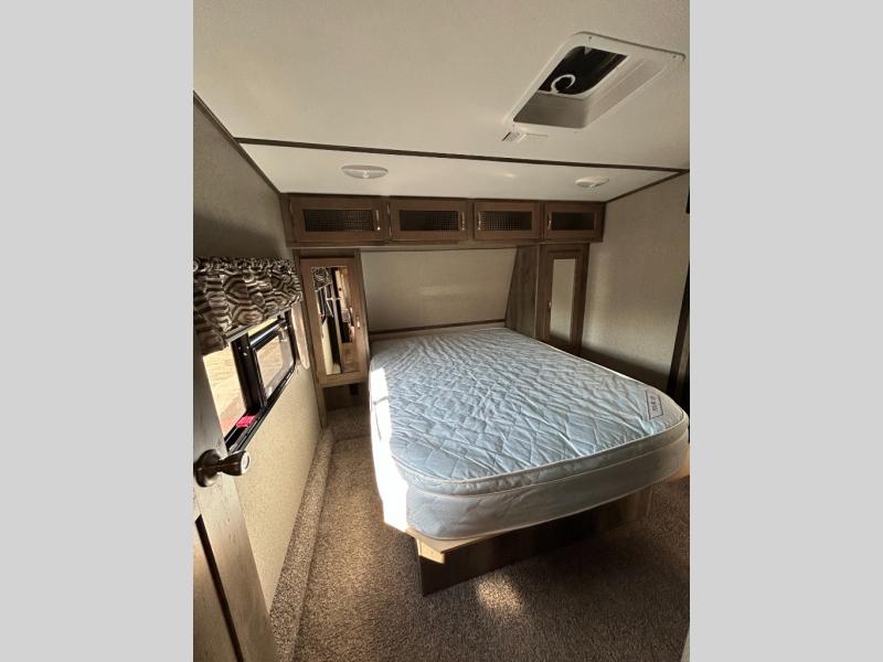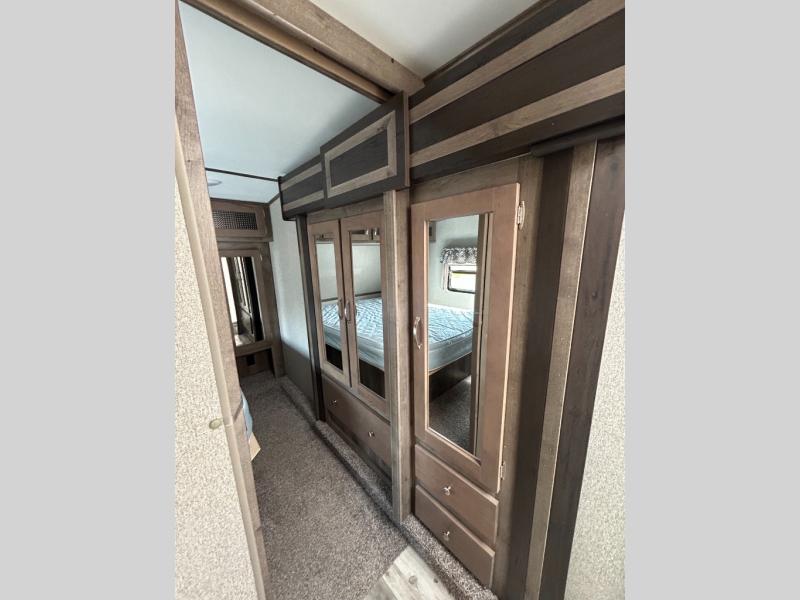 The private front bedroom features a slide out residential queen bed with overhead storage along the curb side, a dresser with overhead storage on the road side, and a full front wardrobe with sliding doors and a closet that has been prepped for a washer/dryer, plus so much more!