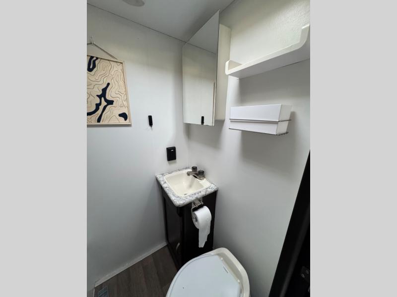 Step inside and notice the front queen bed with full front overhead storage, and a closet at the foot of the bed as the bed is turned width wise with the head of the bed along the road side wall. You will find plenty of storage beneath the queen bed as well.