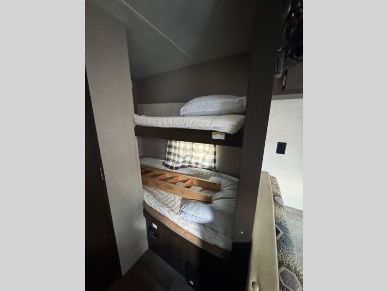 In the rear of this single axle unit find a set of bunks that the kids will certainly love, and a corner bath with tub/shower and toilet, plus so much more!