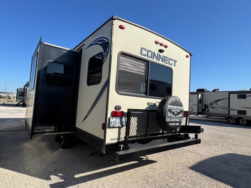 This Connect travel trailer is light enough to easily tow, but it is not light on amenities. All of the things that you love about your home have been included in this trailer. The front, private bedroom with a queen-size bed not only provides a separate place for you to unwind and relax from the day's adventures, but it also provides a private bathroom entrance. Because this unit can sleep five people comfortably during any wilderness excursion, you can bring along the whole family for a weekend of fun, and you can also feel confident in bringing along any necessary camping gear because the exterior pass-through storage will hold all of it.