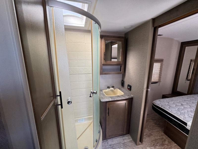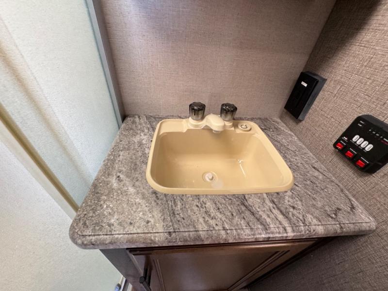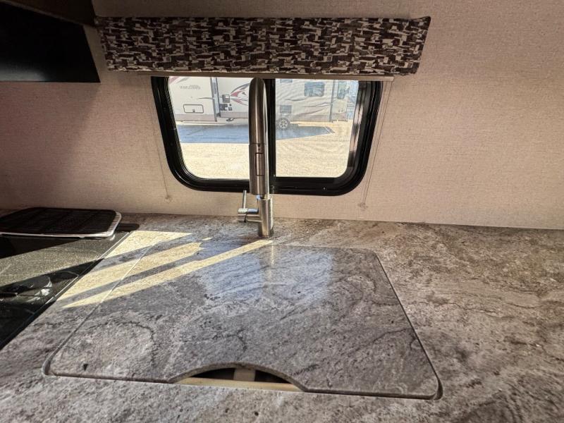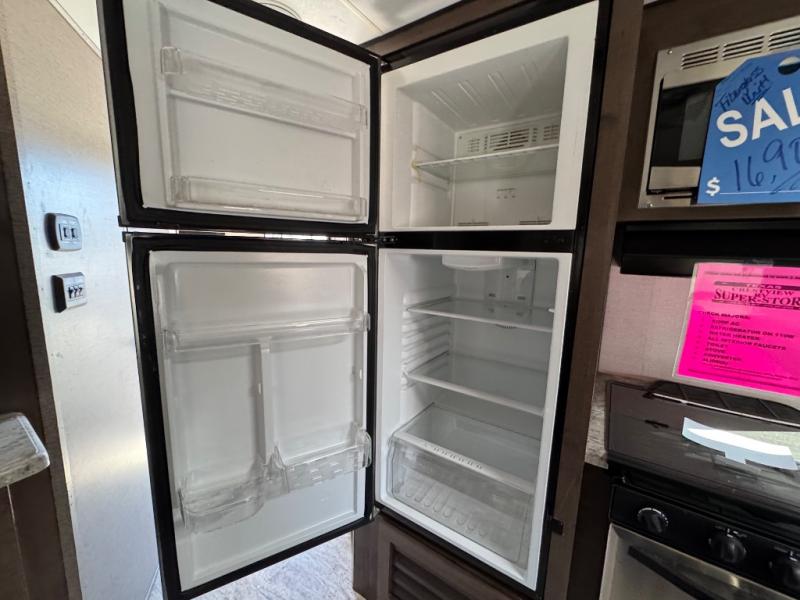 One of the best features of this KZ RV travel trailer is the fully-stocked kitchen that allows you to keep everyone full and satisfied, no matter where you've traveled. The 3-burner range top with oven, gives you a place to whip up your favorite cookie recipe, and the 8 cubic foot stainless steel refrigerator allows you to store those sweets so that they stay fresh for the duration of the trip. If you enjoy nature and want to soak it up as much as possible, then you will undoubtedly be spending your evenings outside underneath the electric awning with LED lights, listening to happy melodies playing on the exterior speakers.