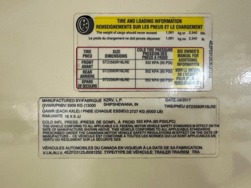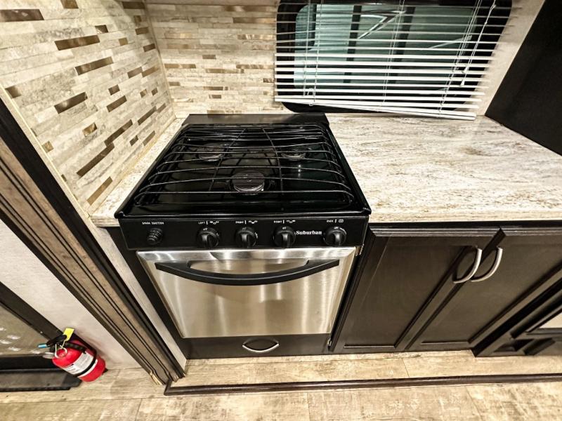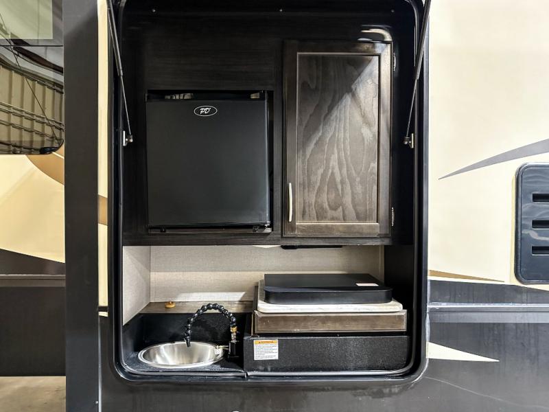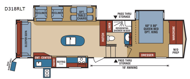 Come enjoy your next weekend away from the hustle and bustle. This Durango 2500 fifth wheel by KZ features triple slide outs for more interior floor space to move around the unit. There is deluxe residential-style furniture throughout including a sleeper sofa, 2 recliners, and a booth dinette. You can relax inside model D318RLT at night while watching the big game or movies on the HD flat panel TV including a sound bar entertainment center and DVD player. The kitchen includes a center island and hutch for more prep and serving space, or you can choose to cook outside on the exterior kitchen including a rear bumper grill, plus much more!