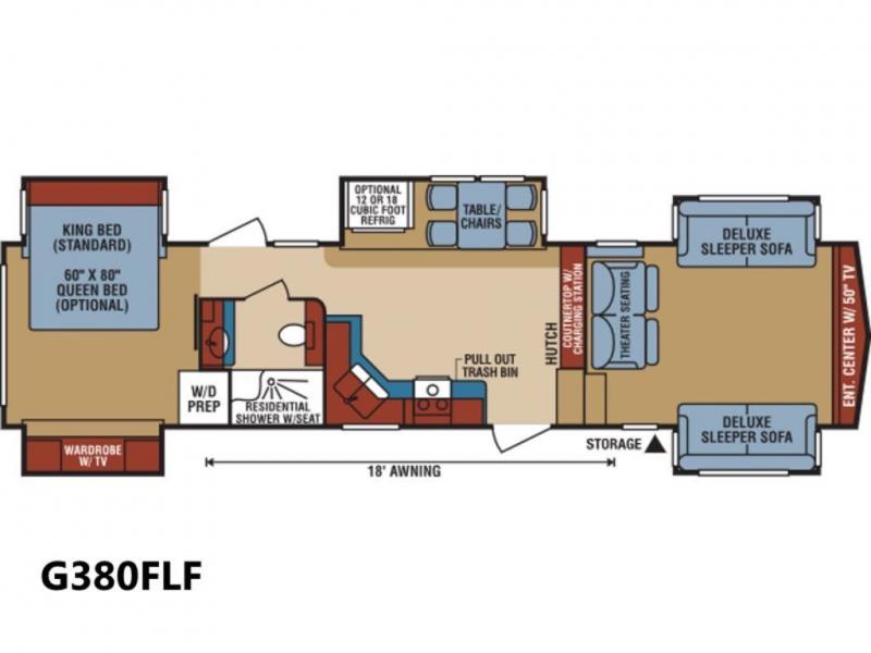 This Durango Gold G380FLF fifth wheel by KZ features dual entry doors, with one entry along the roadside and one entry along the curbside. Plus there is a front living area separate from the kitchen/dining area, which is completely separate from the bedroom that gives a very home away from home feel throughout this fifth wheel. The deluxe sleeper sofas not only give you plenty of seating space, but also gives you extra sleeping space at night. The pass-through storage gives you plenty of space to store all of your camping needs. You can enjoy more time spent outdoors at the outside entertainment center which is conveniently located underneath the 18' electric awning with LED lights.