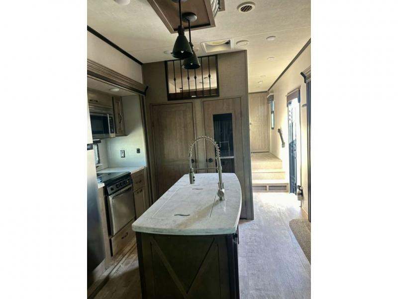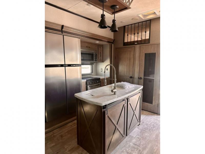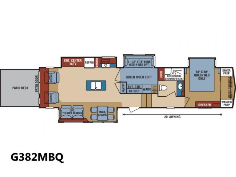 If you are looking for a fifth wheel that is decked out then take a look at this KZ Durango Gold G382MBQ luxury fifth wheel. There are many overhead cabinets inside which provide great storage throughout this model. You will also love the 20' electric awning with LED lights, plus patio deck, just add a few chairs and enjoy the outside without all the dirt at your feet. A queen sized loft is sure to be a pleaser for your kiddos! You can easily store and access your camping necessities inside of the pass-through storage. Meal prep is made easy thanks to the kitchen island that provides you with extra counter and storage space.