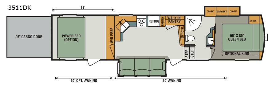 Are you ready to enjoy spending time outdoors riding the trails during the day and then resting comfortably inside of this Sidewinder toy hauler fifth wheel at night? In the 11' separate garage, you will find an area that has been prepped for a washer and dryer, and if you choose to add the washer and dryer, you can easily keep up with your laundry while you are away from home. The second entry door makes it easy to sneak out in the morning and hit the trails without waking up your family. In the spacious kitchen you will find a walk-in pantry and all of the amenities needed to create your favorite meals while you are away from home. The 20' electric awning with LED lights will provide plenty of shade from the sun, and in the evening find yourself being drawn to sit outside just a little bit longer to enjoy the sunset and evening camp fire.