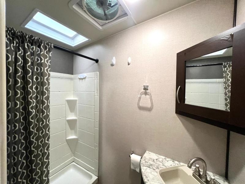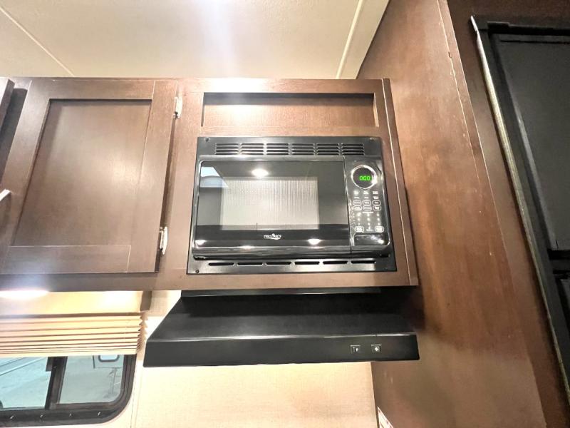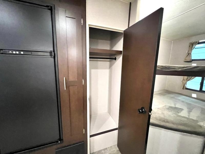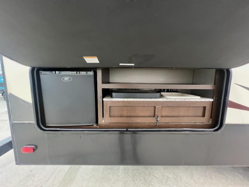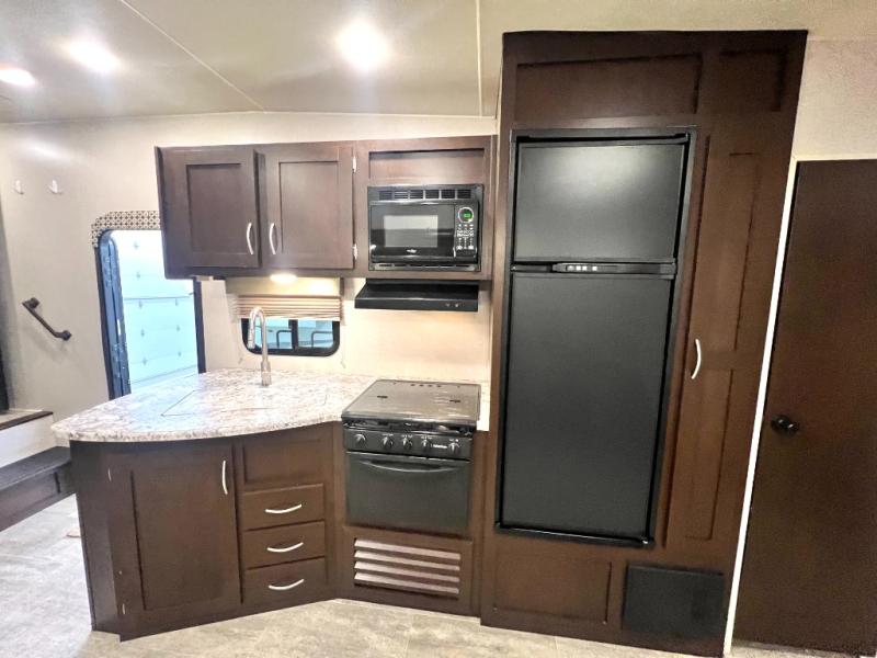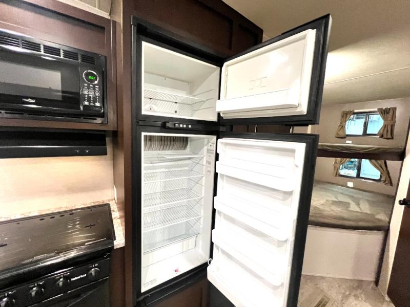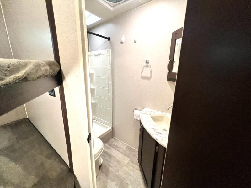Looking for a fifth wheel with a bath and a half, bunk beds, and an outside kitchen? This Sportsmen fifth wheel has everything you want, plus much more. Starting with the full kitchen amenities inside, and an outside kitchen as well. The chef can choose to cook indoors or outdoors which ever they decide. The living room slide includes seating as well as extra sleeping space. The kids will have easy access to the full bathroom next to the 51" x 75" bunk beds, and the owners will have a half bath inside their bedroom, now that's convenient! Take a look today!