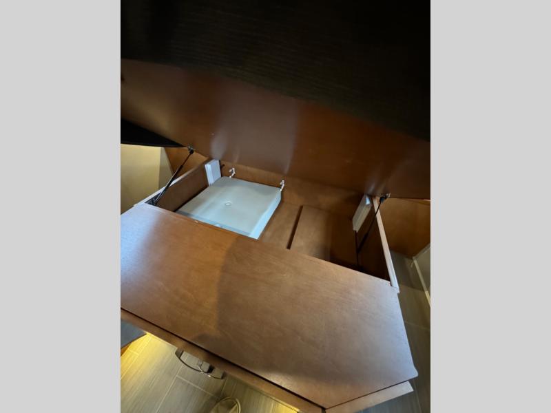 Up front the driver and passenger seats both swivel to create a comfortable place for four to enjoy a conversation with the dinette seating for two immediately behind them. The dinette table and seats can also convert to allow sleeping for one more individual if needed at night. There is also a 28" LED TV in this area for your enjoyment.