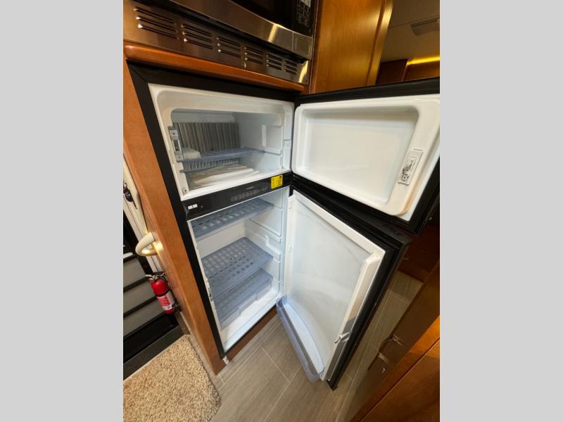 Cook up your favorite meals and snacks in the kitchen provided with a round single sink, a two burner cooktop, and overhead storage for all of your things. There is also a refrigerator to the left of the entry door opposite the sink area.