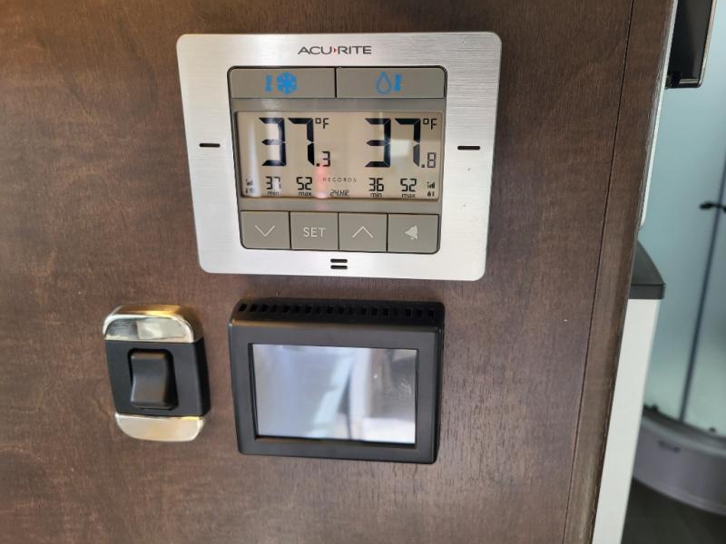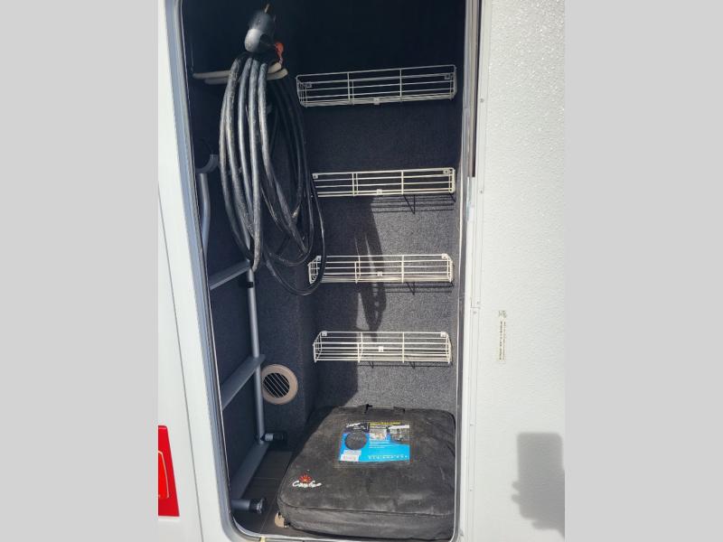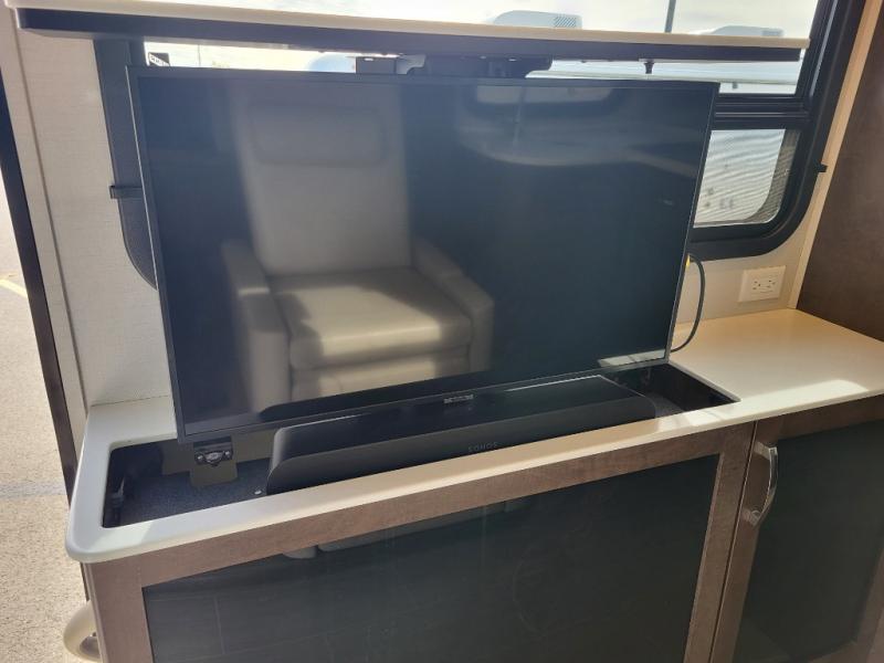 In the kitchen area find a round sink, a two burner cooktop, counter extension, plus upper and lower cupboards and cabinets for storage. There is a refrigerator opposite, and a pull-out pantry for even more storage for canned and dry goods. The 39" LED TV on a lift is located just inside the door to the left for your viewing pleasure.