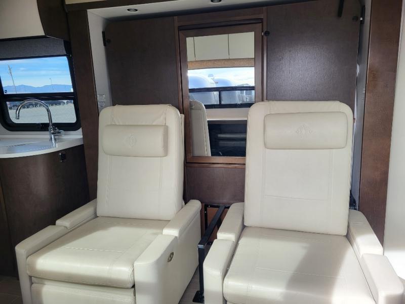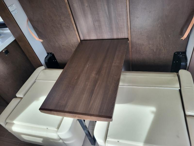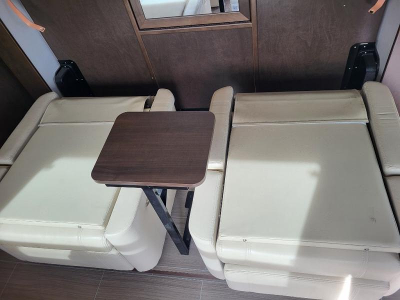 Step inside and notice two lounge chairs straight ahead with a table between the two. The driver and passenger cab seats also swivel to create more of a conversation area. At night lower the Murphy bed down to create a comfortable space to sleep.