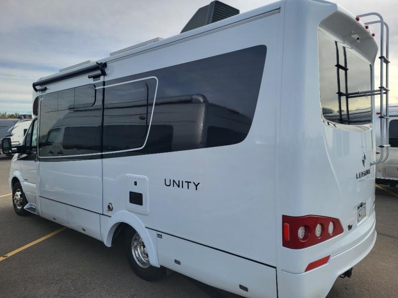 This Leisure Travel Unity class B+ diesel unit 24MB offers a single slide out with a queen size Murphy bed included, a 39" LED TV, curved European cabinetry throughout, and a bathroom that will make any class A owner envious.