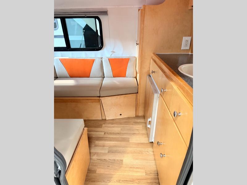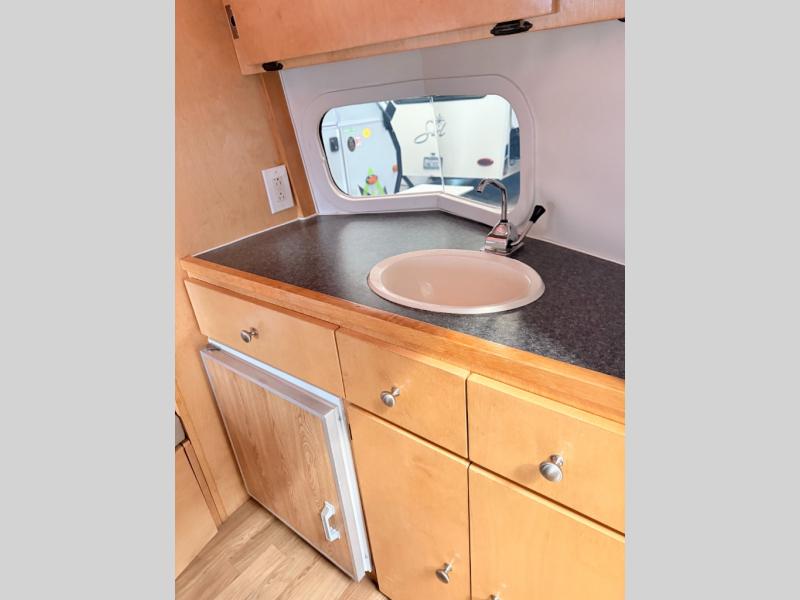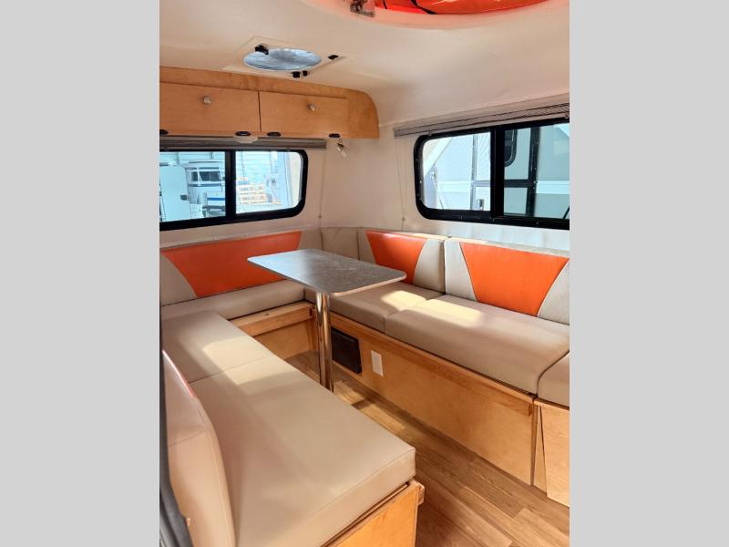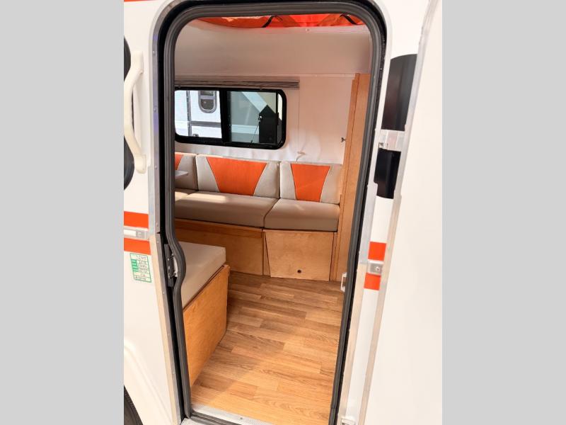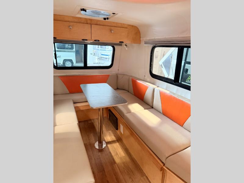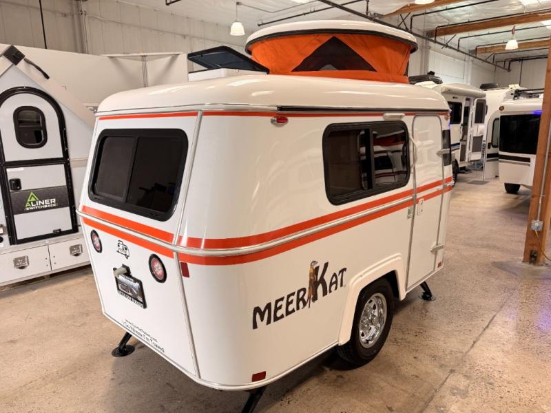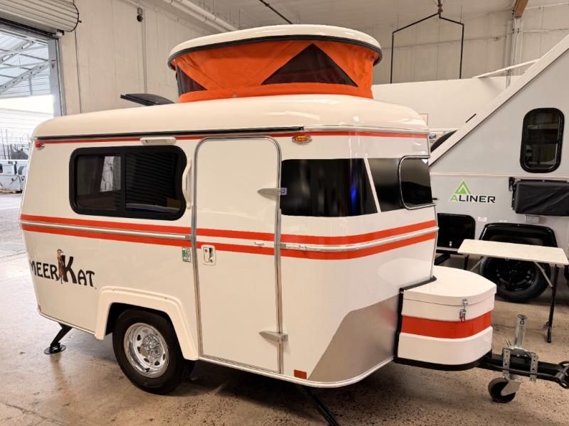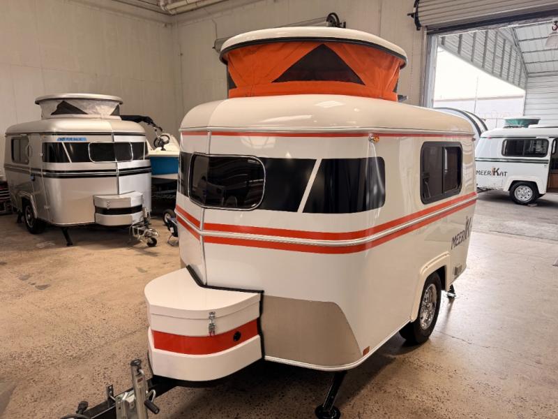 Bigger is not always better, and this little MeerKat will prove that to any interested camping couple that is looking to tow behind their everyday car. The MeerKat provides you a step up from tent camping where you can enjoy a dry place to sleep, eat, and store your things easily. And the included porta potty allows you to skip the public facilities in the middle of the night. The dinette table and wrap around seating can easily transform into a bed for a comfortable night's sleep. Three opening windows will allow you to enjoy fresh air circulating throughout both day and night. You will find under seating storage, plus several cabinets to tuck your things out of sight when not in use, and the front countertop provides a handy sink, plus a one burner camp stove is also available along with an icebox for your perishables. The MeerKat can easily be customized to suit your style of camping. You can add an optional awning, front storage box for more gear, a refrigerator, or induction cooktop, plus more. It's time to check this tiny camper out!