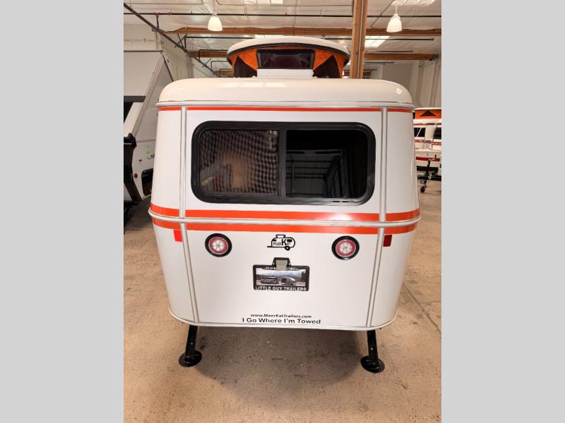 If you are looking for simplicity in camping, the MeerKat is the way to go! This unit weighs in at 1180 lbs. making it easily towable by any 4-cylinder vehicle. Not only will this provide you with great fuel economy, but it is also light enough and small enough to maneuver easily into a garage for storage. The pop-top roof creates more headroom inside, plus added ventilation with zippered mesh screening that opens for more circulation besides the three windows that include blinds for privacy. There is a 12 volt/110 power system, LED lighting, and an icebox for your cold items. You can also add an optional refrigerator if you wish, or maybe a front storage box, an awning, side room tent, spare tire & rack, plus more. Come select your perfect MeerKat trailer and enjoy!