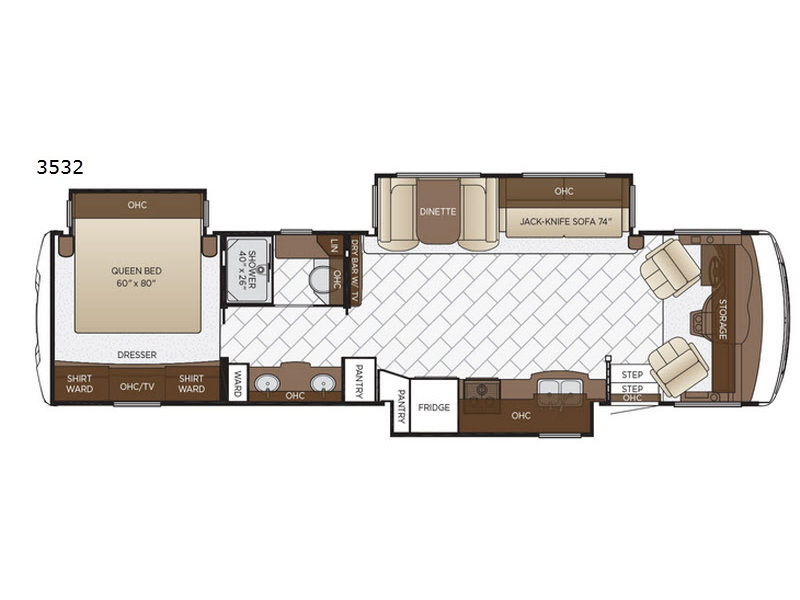 You will want your next road trip to extend just a little bit longer with this triple slide out 3532 Bay Star class A motor home. With plenty of comforts throughout this model it will not seem like you are camping, but rather enjoying your second home! You can easily bring along all of your necessary camping items and store them in the overhead cabinets. Enjoy visiting with family and friends at the 74" jack-knife sofa, and fixing your favorite meals is a breeze in this fully-equipped kitchen. The walk-through bathroom has a private toilet/shower area and across the hall you will find his/her sinks!