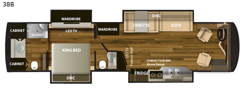 Slide the door back to enter the walk through bedroom. Inside you will find dual slide outs allowing more floor space. There is a wardrobe slide with an LED TV, and a king size bed in the opposite slide out. Slide the next door open to enter the rear full bath. You can enjoy a shower with seat, toilet, vanity with sink, and dual closets. You may choose to add an optional washer and dryer if you like.