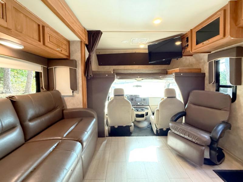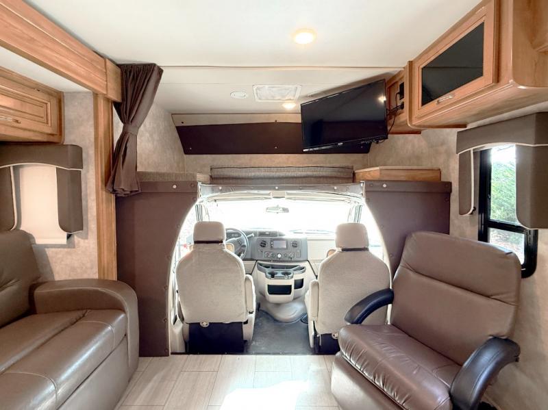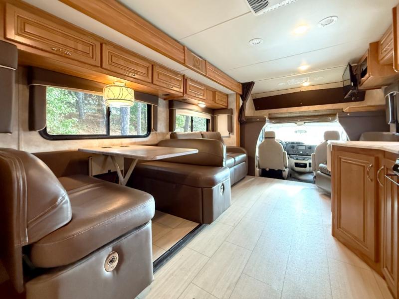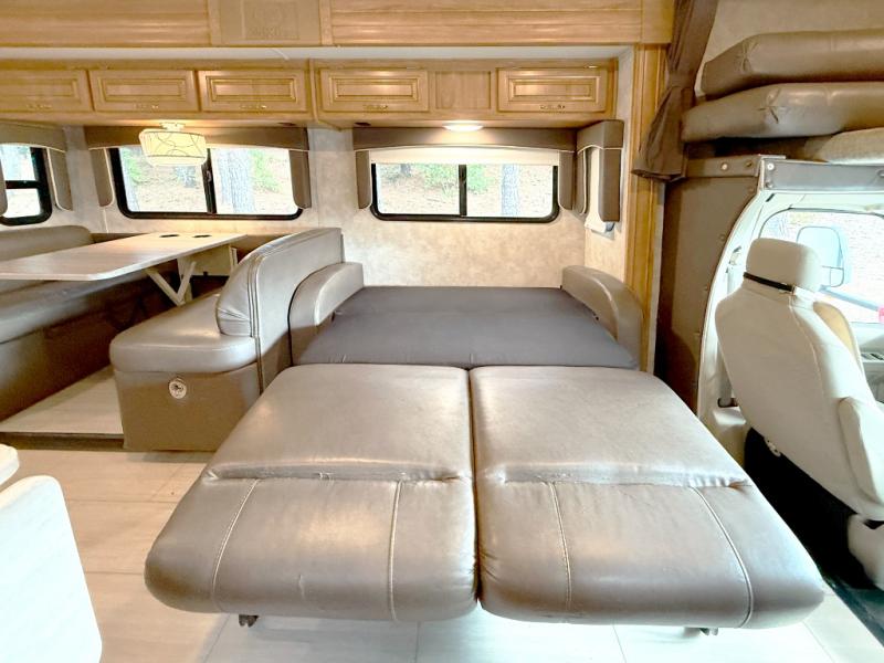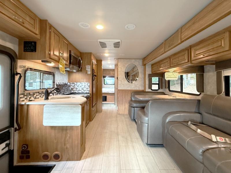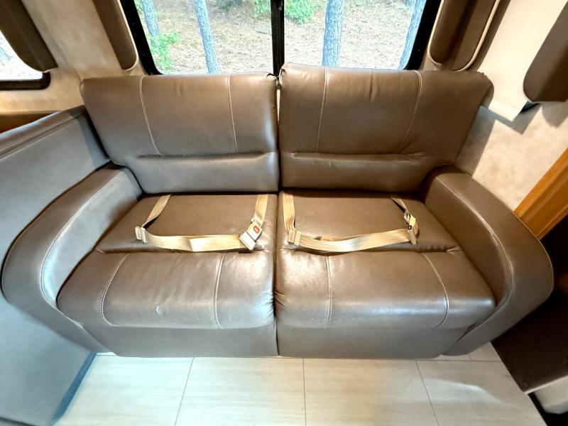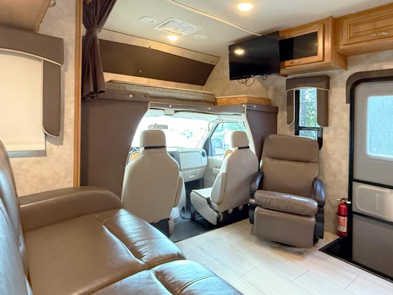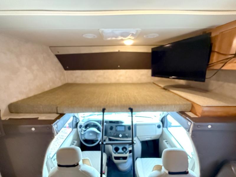 Step inside to find a euro recliner to your right next to the front cab area. You will also find a cab over bunk with an LED TV for extra sleeping space and inside entertainment.