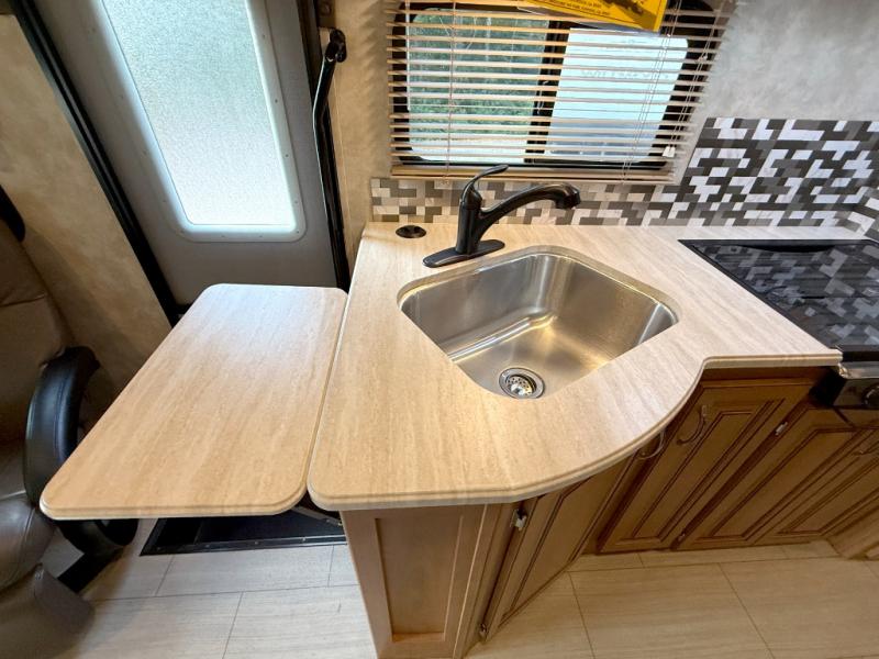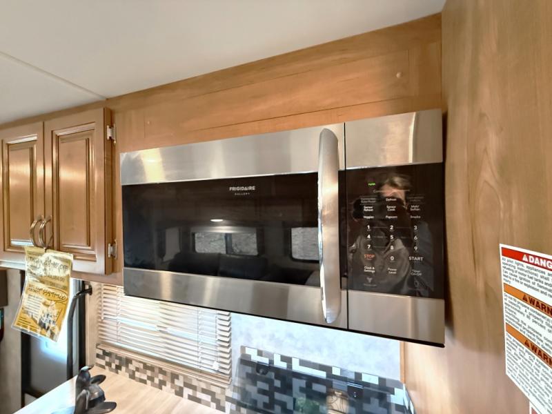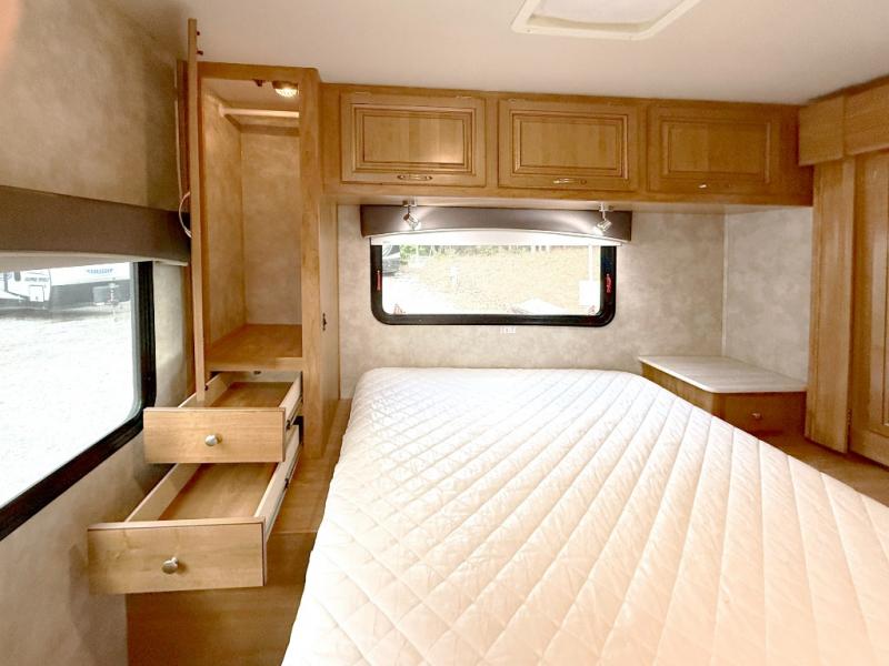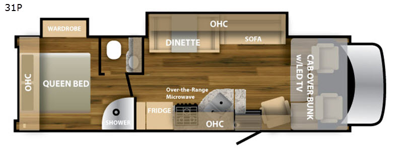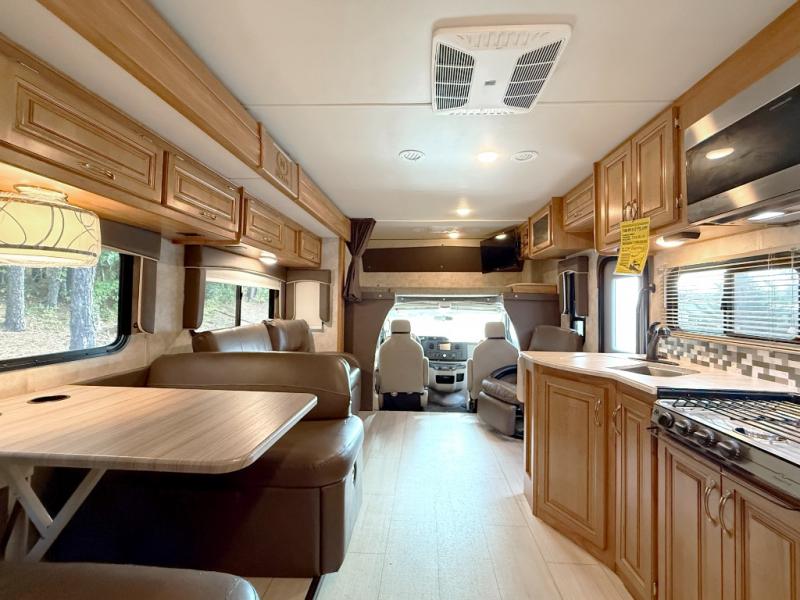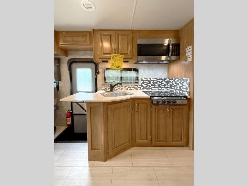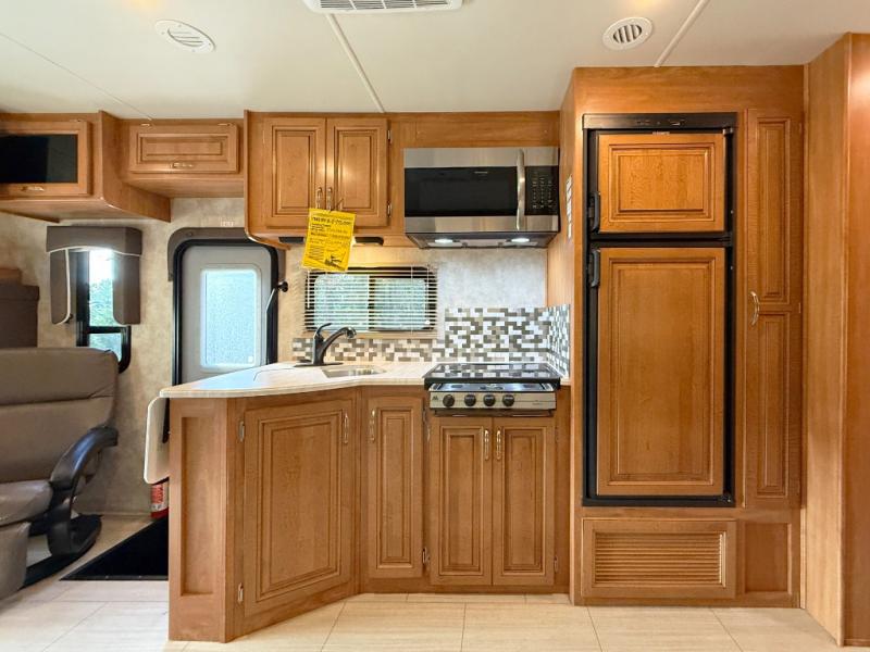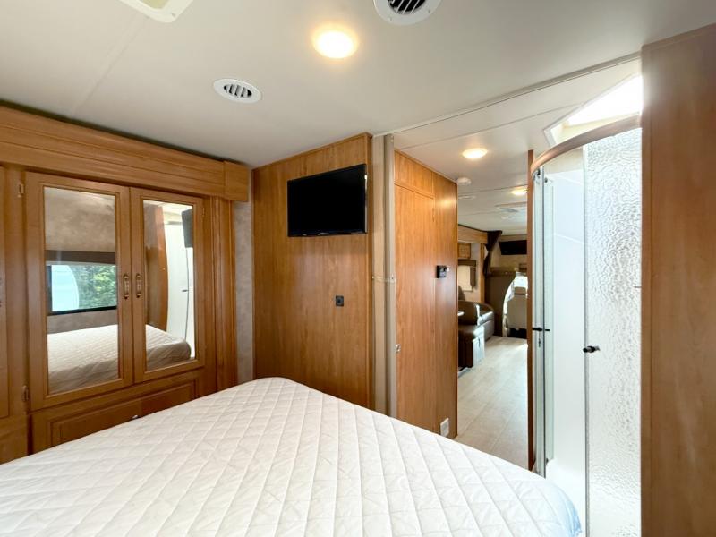Step inside to find a euro recliner to your right next to the front cab area. You will also find a cab over bunk with an LED TV for extra sleeping space and inside entertainment.