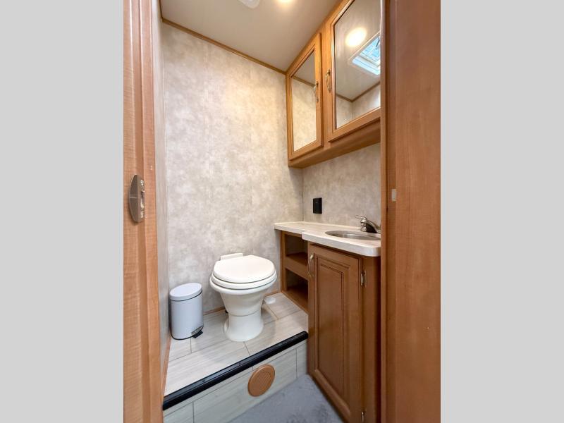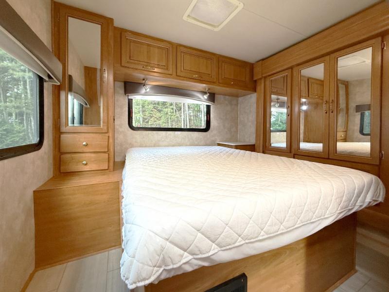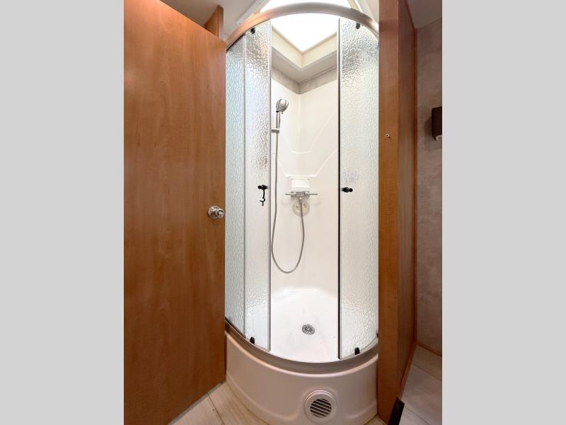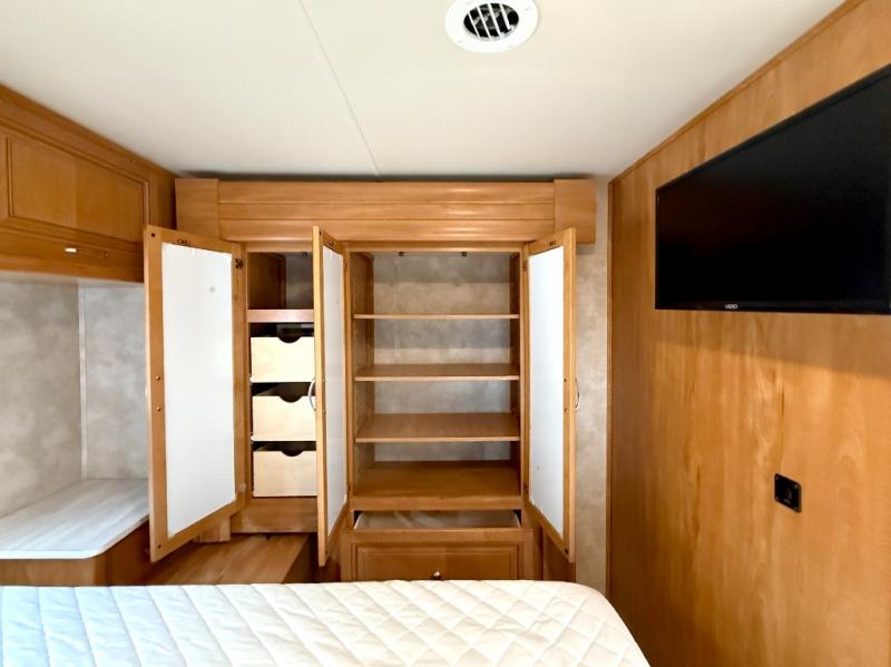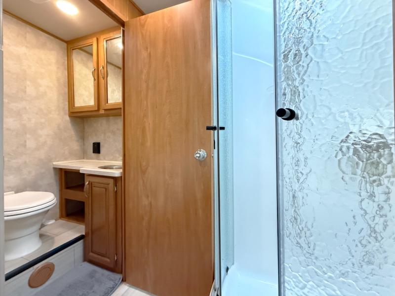 Head toward the rear to find a radius shower on your left inside the bedroom, and a private toilet and vanity with sink on your right. The queen size bed is along the rear wall including overhead storage, bedside wardrobes and nightstands, and the second slide out in the coach. This slide provides a wardrobe to keep all your traveling clothes clean and tidy.