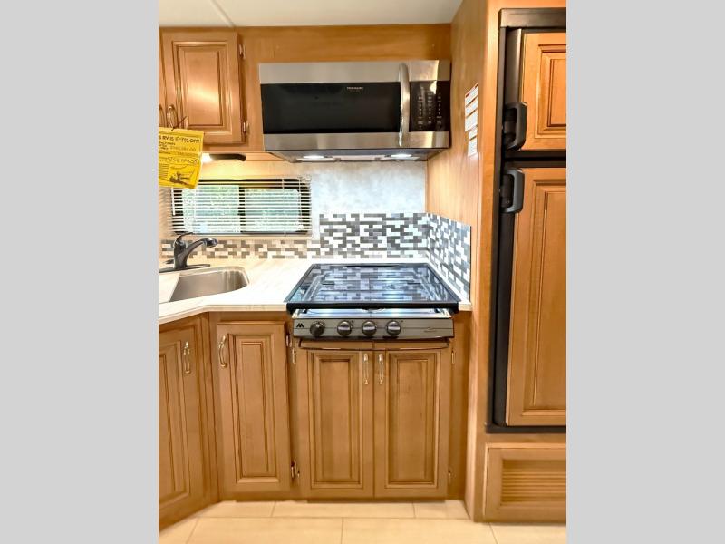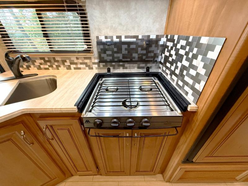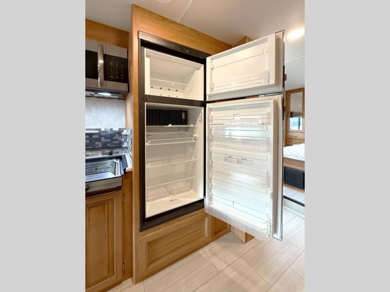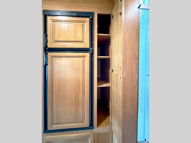 On the opposite side the kitchen provides a double sink, counter extension, a three burner range with microwave above, plus a refrigerator. Next you will see a pantry to store all of your dry goods. You will have no problem making your favorite snacks and meals anywhere you stop.