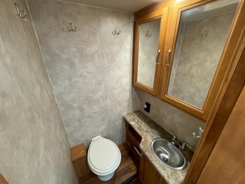 Step inside 32P about mid-coach to find a refrigerator to your left, and the rest of the kitchen amenities straight ahead. There is a double sink and counter extension along the interior wall, plus a roadside slide out. The slide includes a three burner range, microwave, and overhead cabinets, plus a sofa. On the opposite side you can dine or relax at the booth dinette.