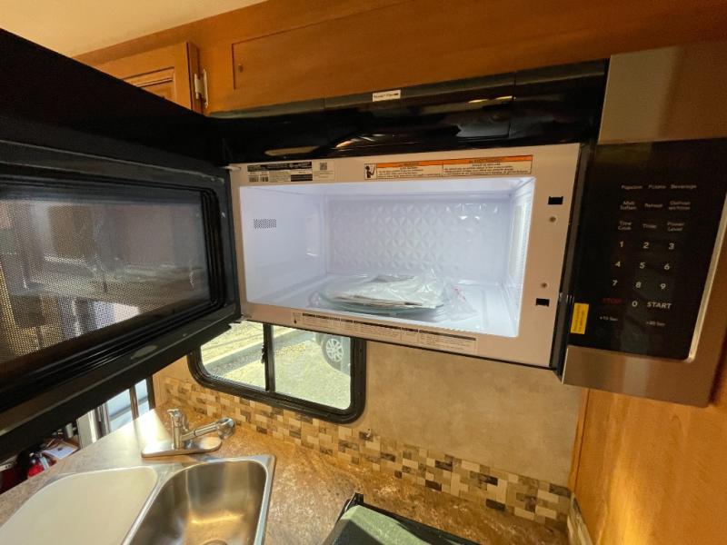 The front cab area includes a cab over bunk with an LED TV for extra sleeping space and inside entertainment. The sofa and dinette mentioned above also provide extra sleeping space if needed.