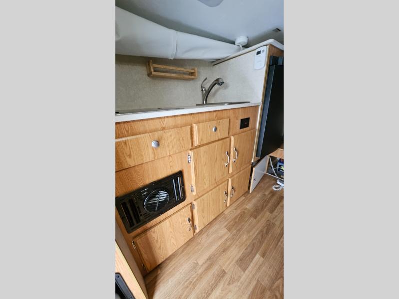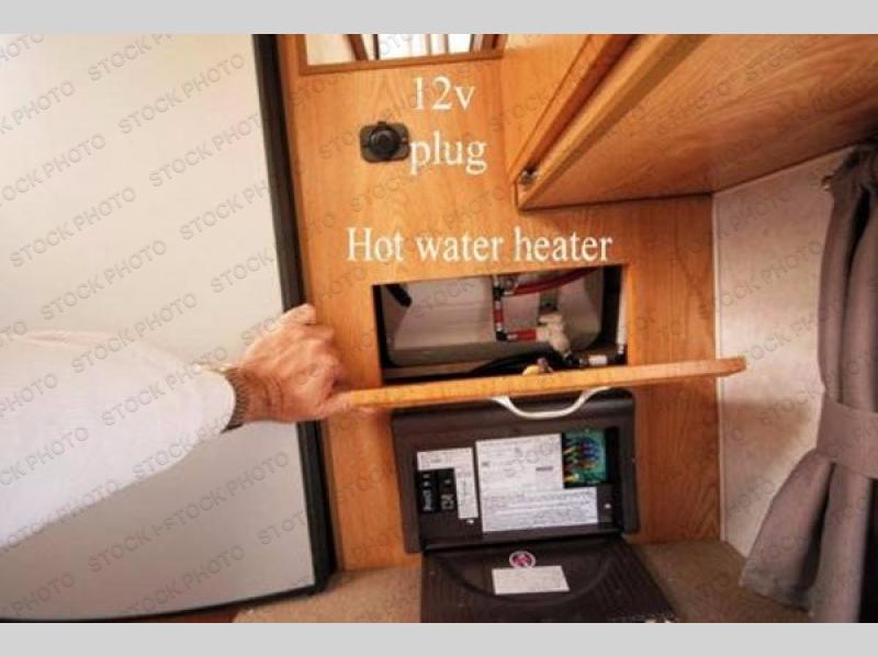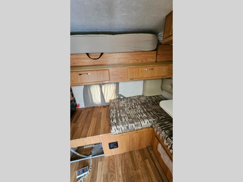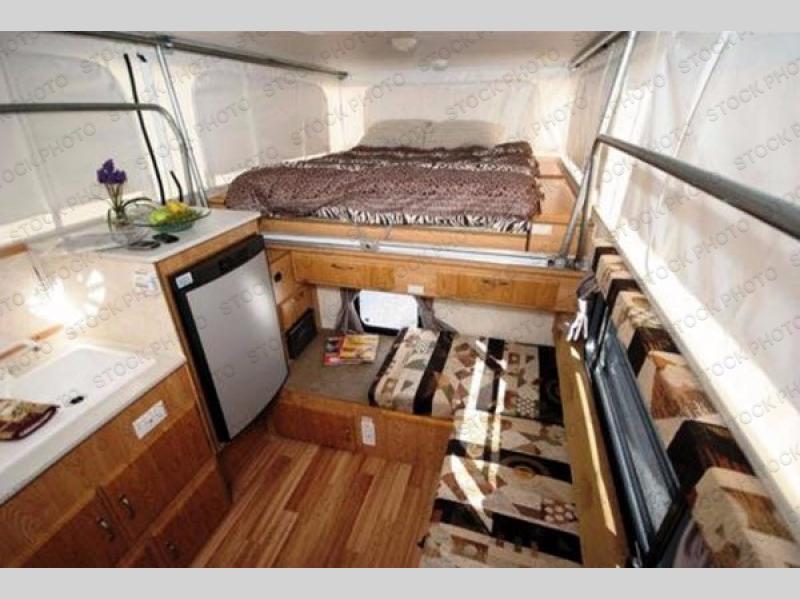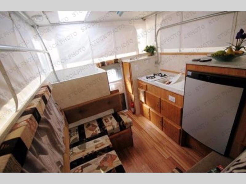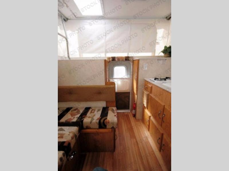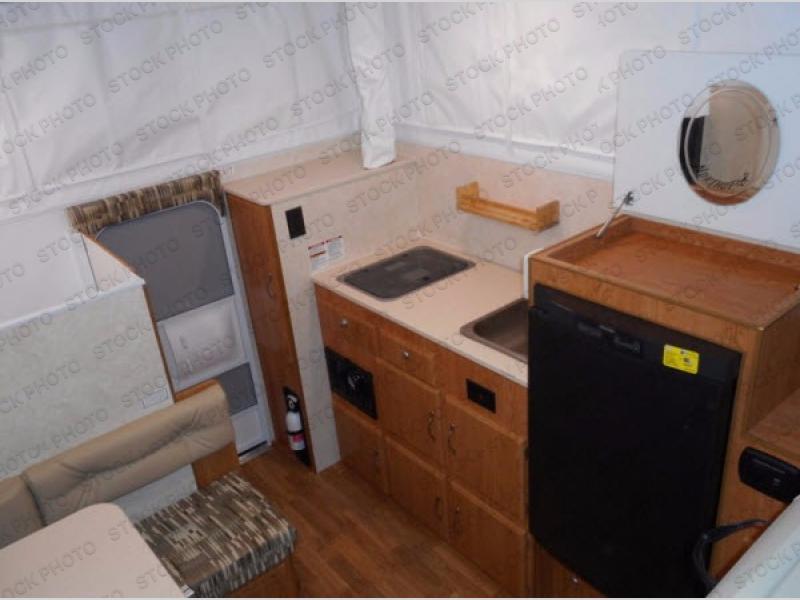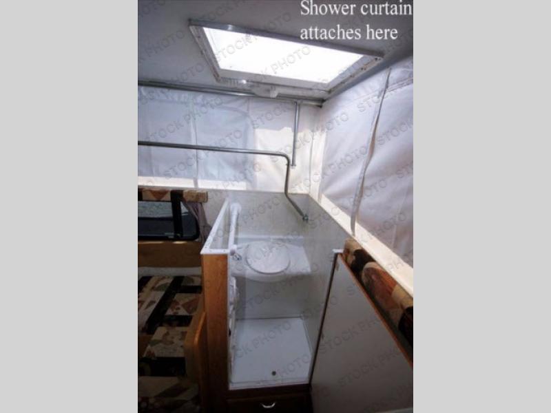 This Northstar Pop-Up 850SC truck camper will easily fit on short (6'4" to 6'10") or a long bed (8') truck. This model features a u-dinette where you can enjoy your meals. Stepping inside the camper, to the right there is a shower and cassette toilet. Just past the bath area you will find a u-dinette. Along the opposite side of the camper there is a wardrobe, two burner range, sink, and refrigerator.