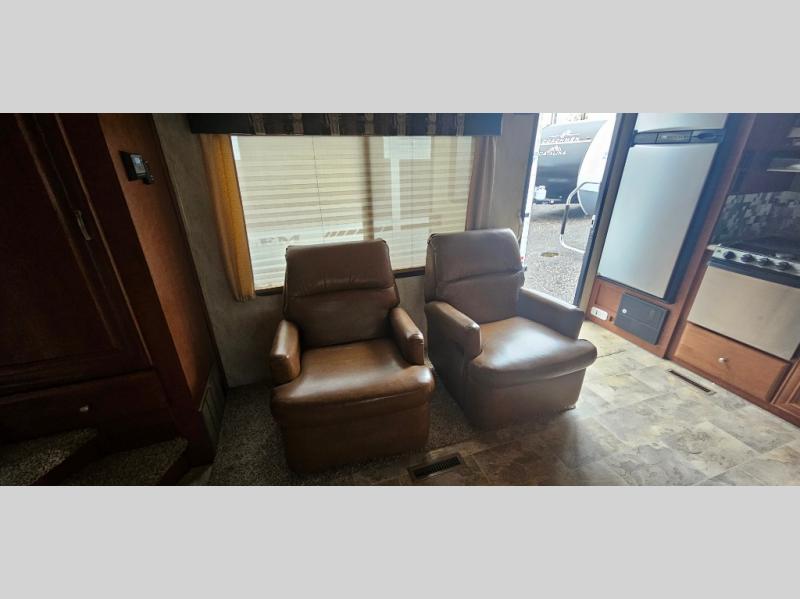 Northwood offers this Fox Mountain 255RKS fifth wheel with a single slide out and rear kitchen layout. As you enter this fifth wheel, there are two lounge recliners to your right with overhead cabinets and a ceiling fan above. Continuing around to the far side, the slide out features a booth dinette, overhead cabinets, a pantry and exterior storage. Just inside the slide, there is a 32" LED TV, as well as upper and lower storage. Along the rear, you will find the kitchen amenities with a extra large 10 cu. ft. refrigerator, an L-shaped counter, a three burner range, a double sink, an overhead microwave, and overhead cabinets for dishes. Inside the front private bedroom, there is a queen bed for you to enjoy a good night's rests, plus wardrobes and nightstands on either side!