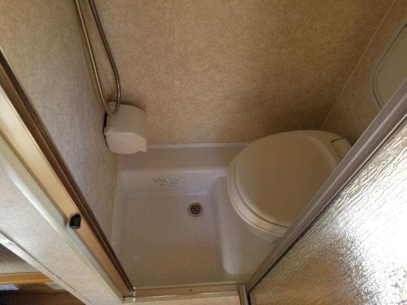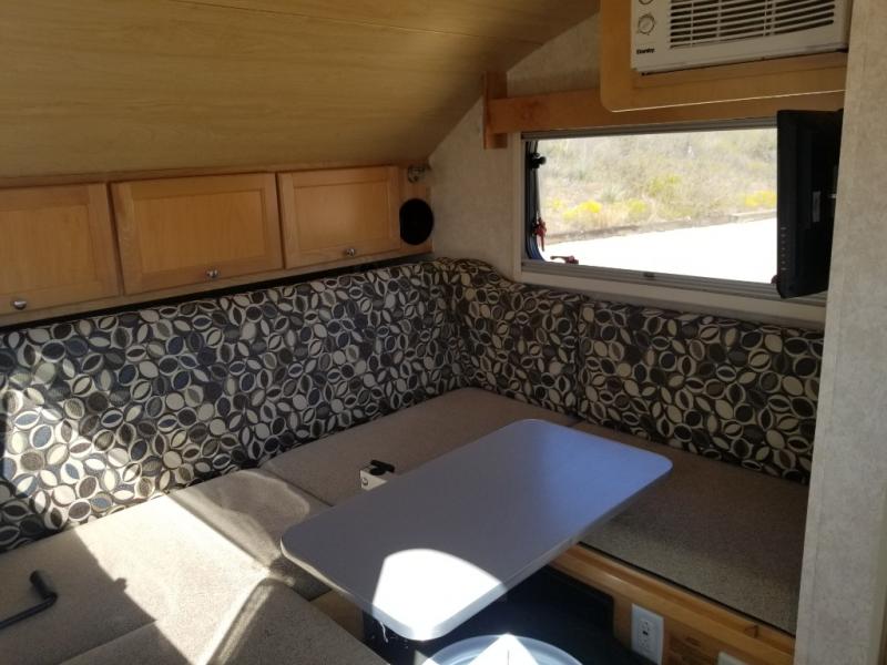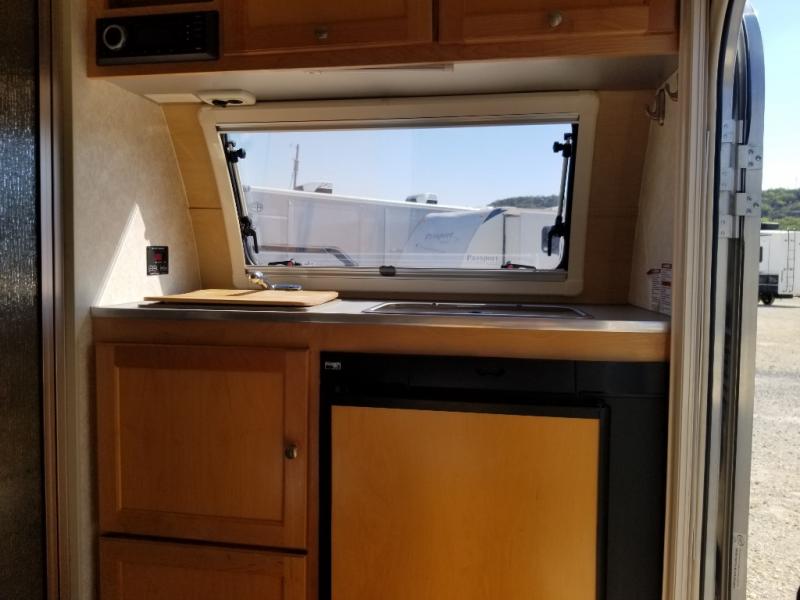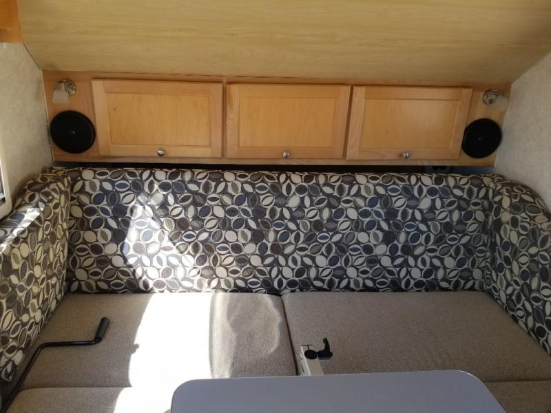 The compact size makes it easy to tow. The kitchenette is equipped with a two-burner stove, sink, and refrigerator. The dinette area easily converts into a comfortable bed.