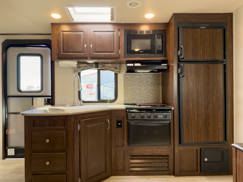 - Kitchen & Amenities: 3-burner cooktop, microwave, refrigerator, stainless sink, overhead cupboards