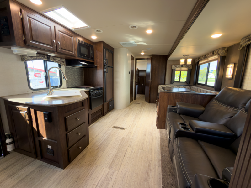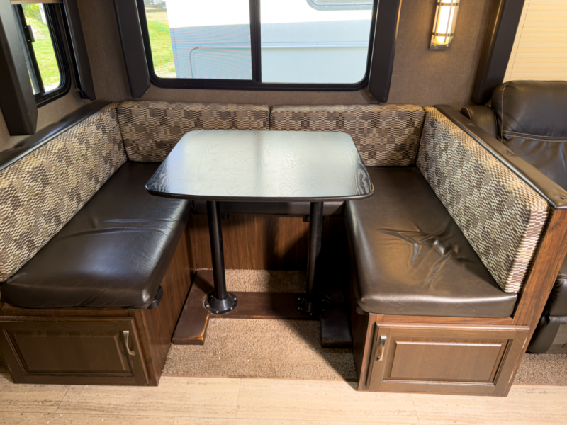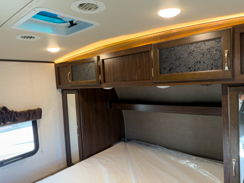 - Utility & Comfort: Fresh/Gray/Black tanks, furnace, roof vent, power awning, LED lighting