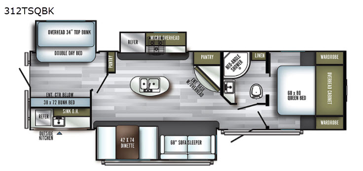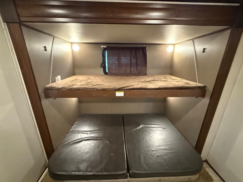 This SolAire Ultra Lite travel trailer is such a spacious and lightweight structure that provides ample room to store traveling gear, as well as plenty of sleeping space. The private bunkhouse combined with the private master suite are what give this trailer the ability to sleep nine people while on the road. Because of the addition of three slides, the kitchen island sits neatly in the center of this trailer giving you a larger area to cook up a delicious home-cooked dinner on the 3-burner range top.