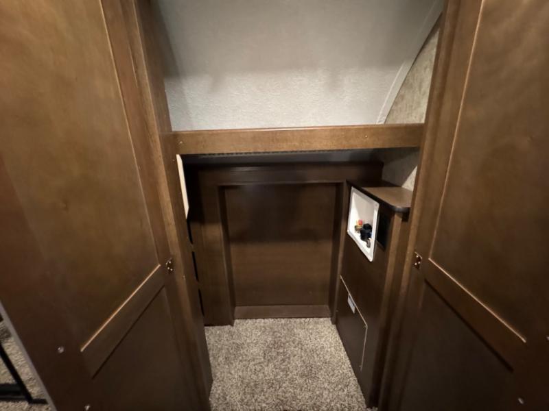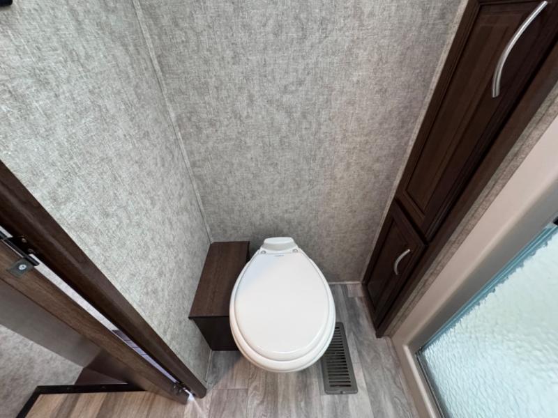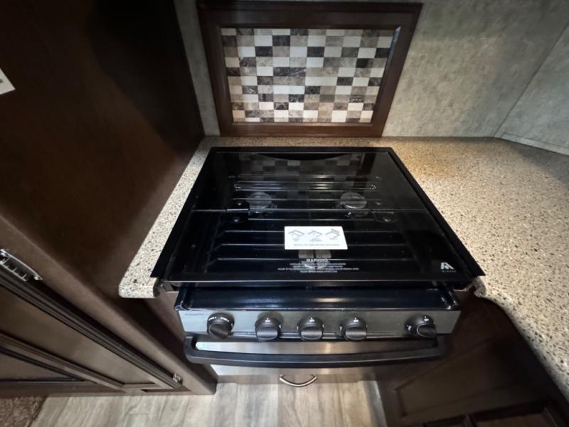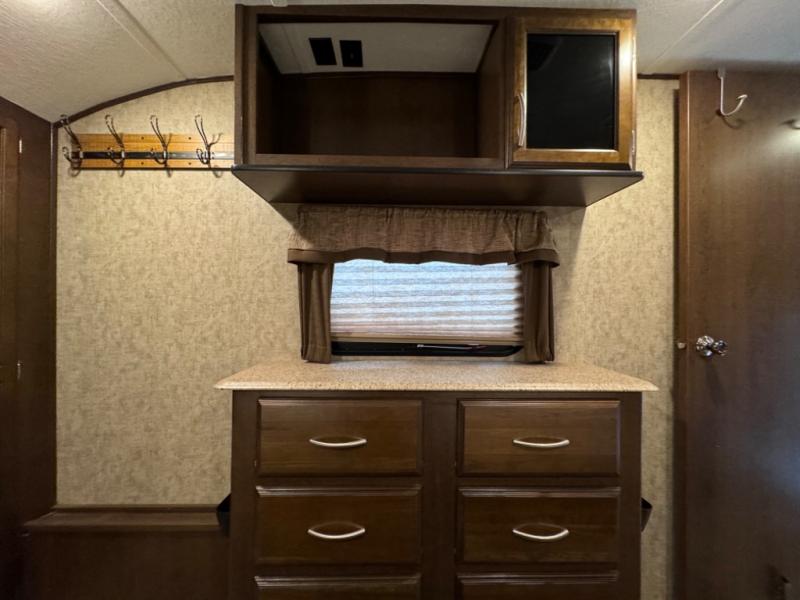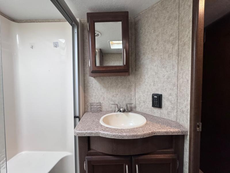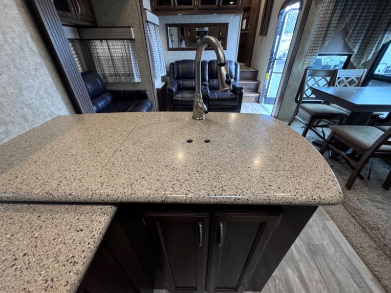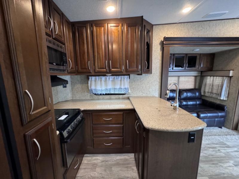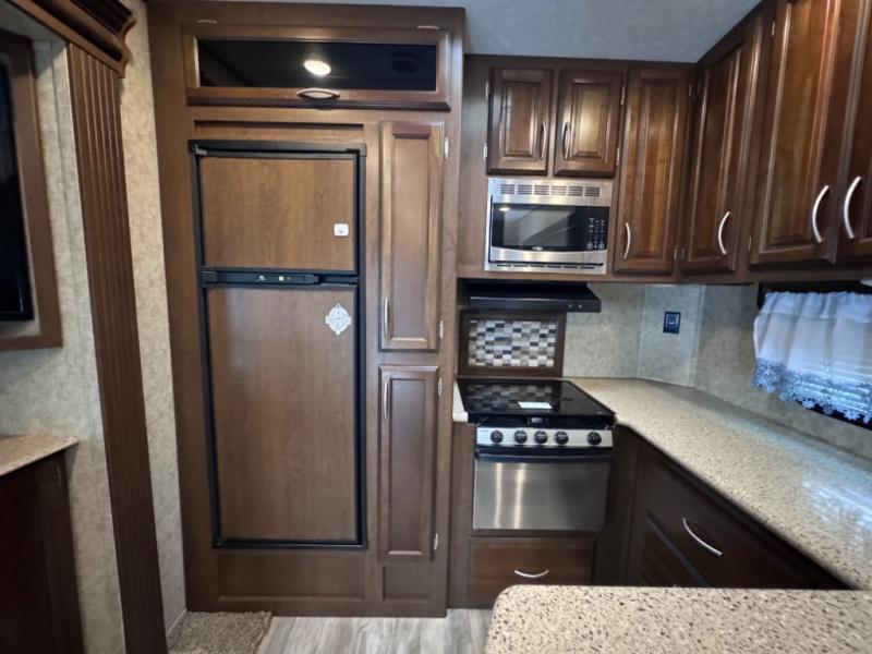 This Crusader fifth wheel contains all of the elements that you love best about your own home. Whether you have stopped to take a quick nap in the front, private bedroom or you are whipping up an afternoon snack in the rear kitchen, you will enjoy the many benefits that this unit provides. Everyone will love gathering together in the open-concept living area because the three slides that have been inserted in this unit allow it to offer extra room to keep this fifth wheel spacious and accommodating.
