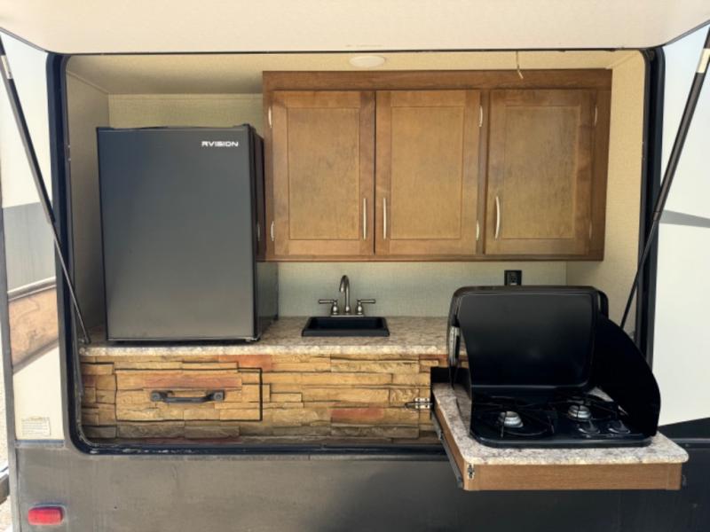 Traveling across the country in this Crusader fifth wheel will be your family's new favorite vacation getaway because of all of the stylish and comfortable amenities it provides. With enough space to sleep seven people, you won't feel crowded as you drift off to sleep each evening, and the four slides that have been included in this unit allow for extra items, like the outdoor kitchen and large kitchen pantry, to be added.