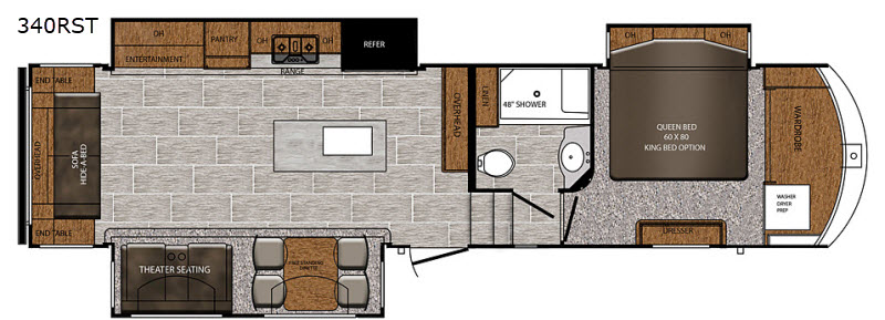 When you take this Crusader fifth wheel out on your family's next adventure, you won't be able to tell you've left your own home because of all the home-like conveniences this unit provides. The front, private bedroom gives you the separated space you are used to having, and the large 48" shower with seat gives you room to comfortably rinse off each morning. You will find it easy to prepare each day's meals on the kitchen island, and the three slides allow this trailer to include plenty of cabinet and storage areas throughout the interior.