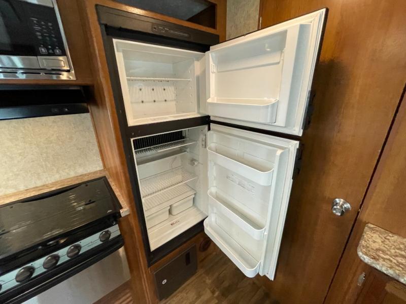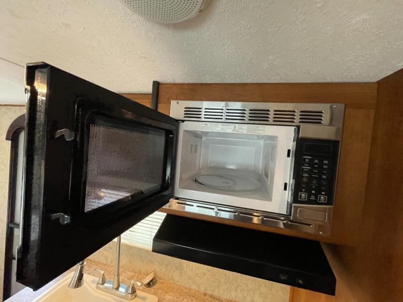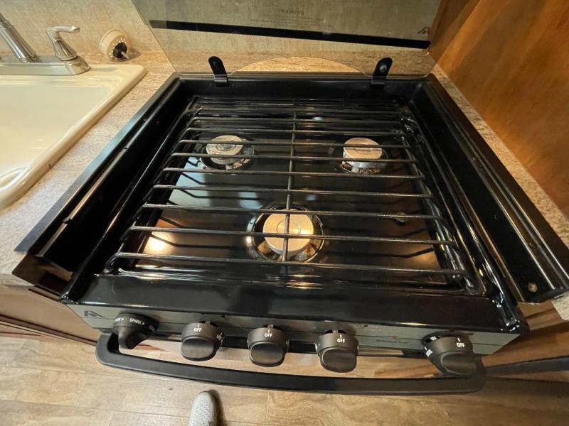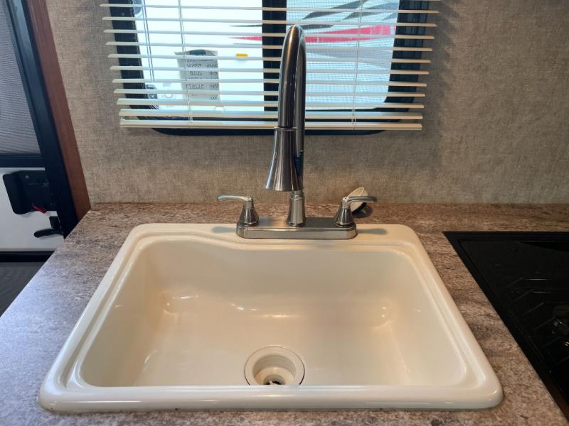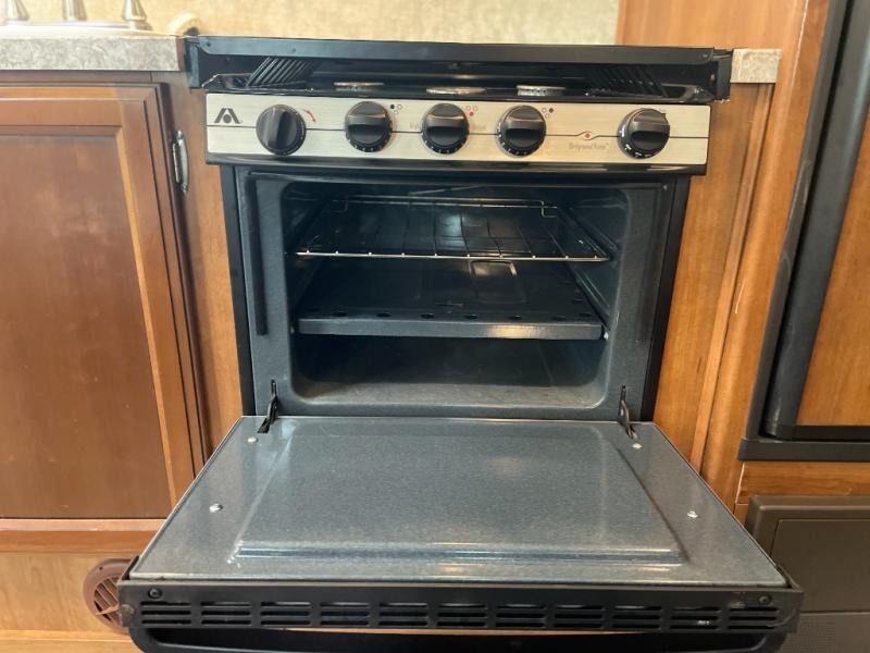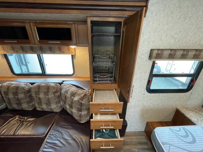 As you enter to your left there is a double kitchen sink, three burner range, and a refrigerator. The opposite side has a slide out u-sofa with a u-dinette table and a pantry. Next to the slide you will find an entertainment center for your inside enjoyment.