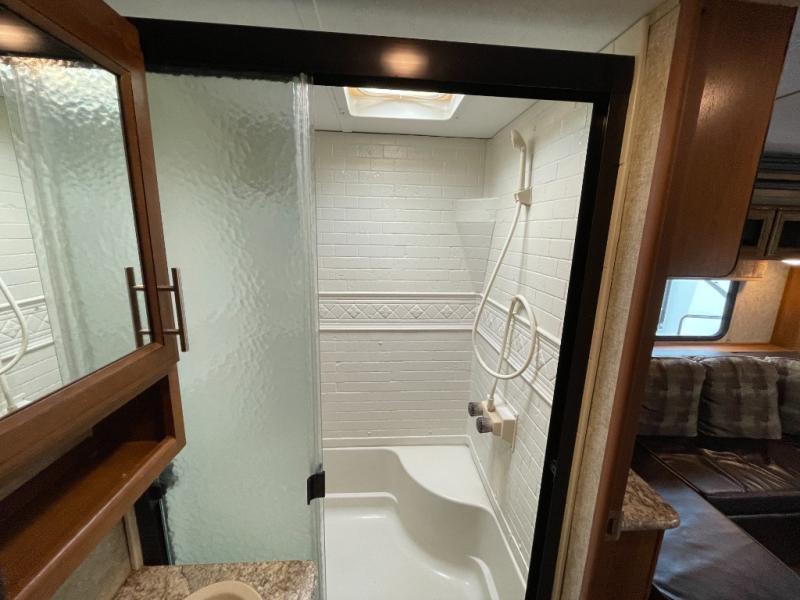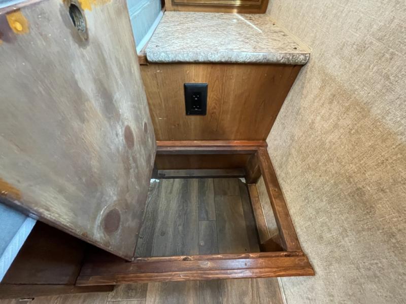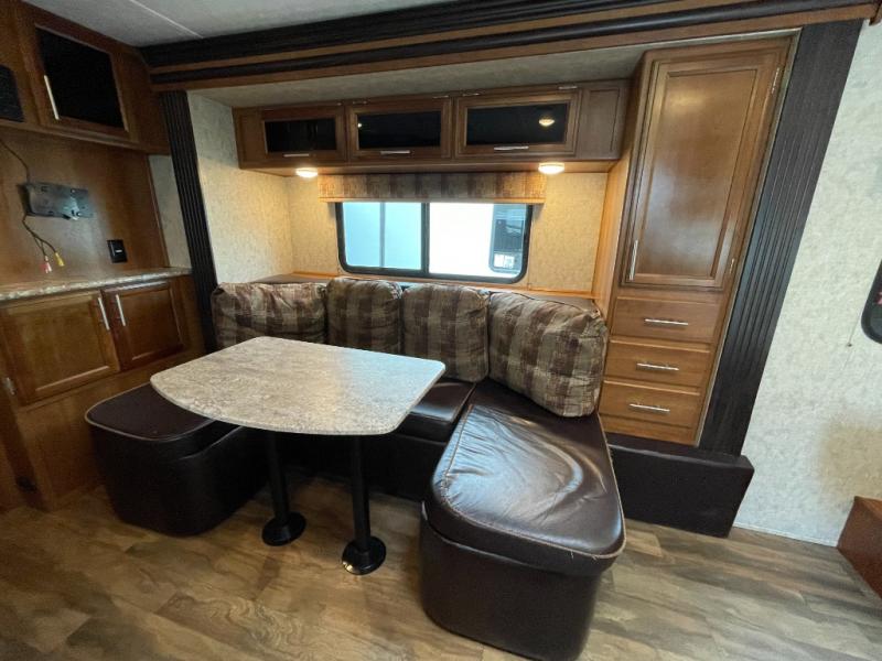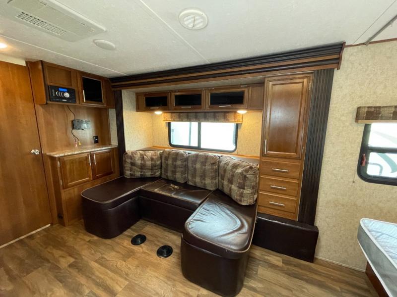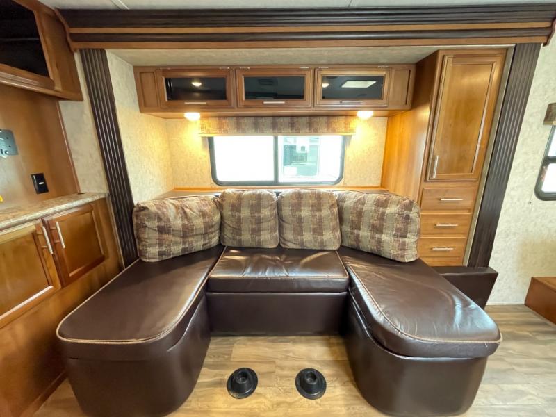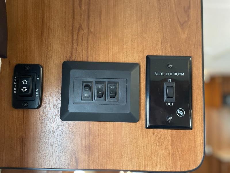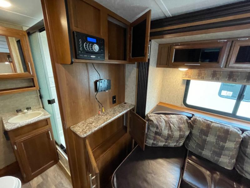As you enter to your left there is a double kitchen sink, three burner range, and a refrigerator. The opposite side has a slide out u-sofa with a u-dinette table and a pantry. Next to the slide you will find an entertainment center for your inside enjoyment.