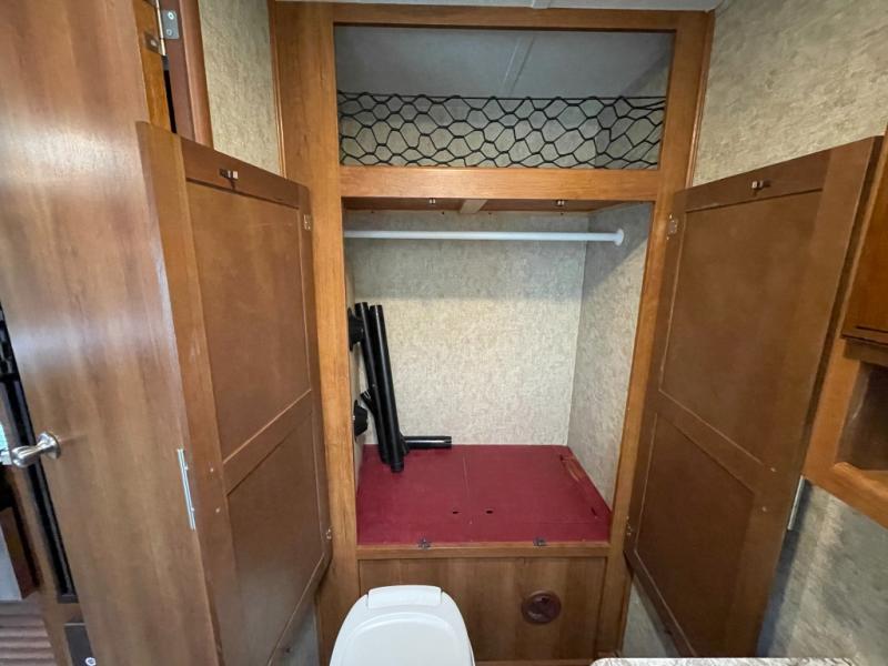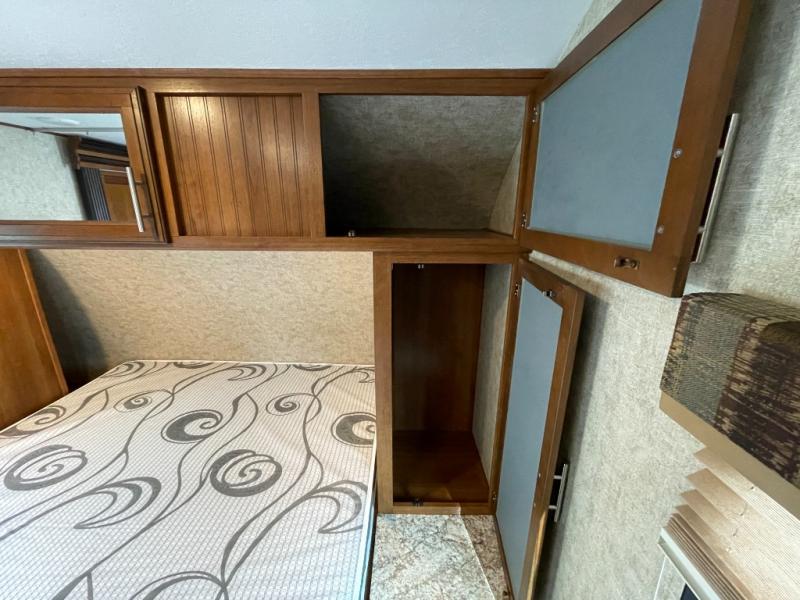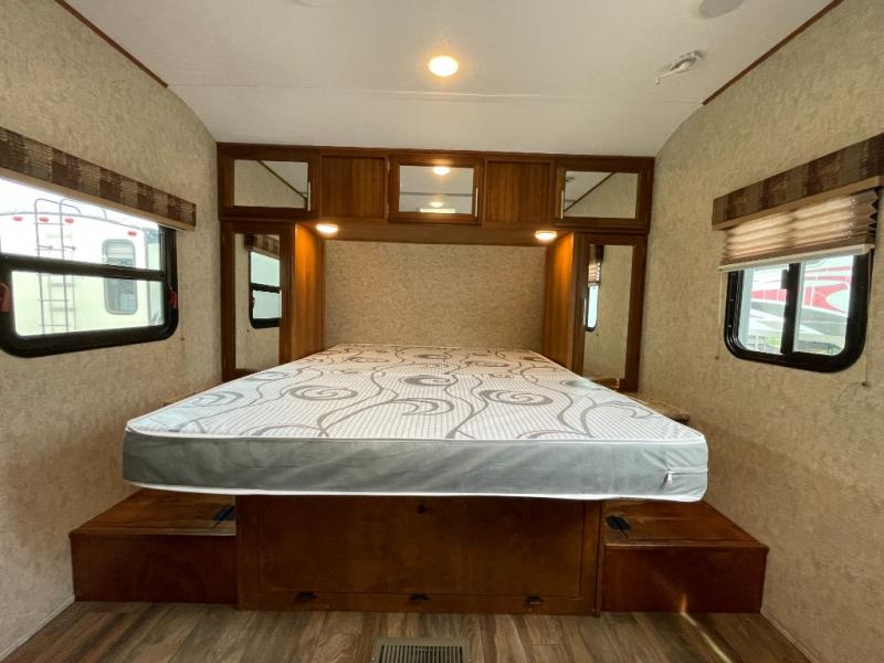 In the front of the travel trailer you will find a queen bed with shirt closets and nightstands on either side, and overhead storage. There is a privacy curtain as well.