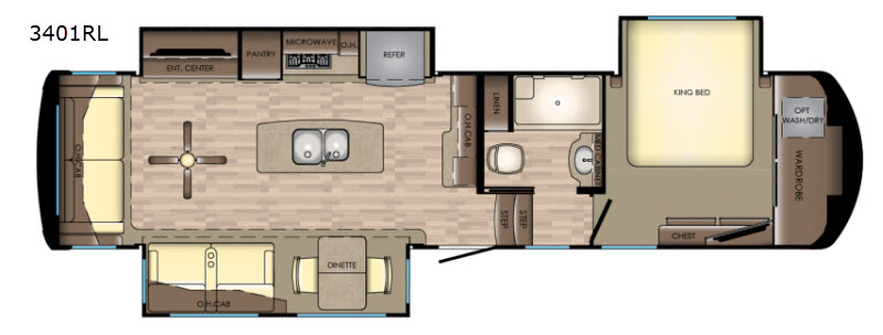 Come make this luxury fifth wheel your home away from home while you camp at your favorite campground! Model 3401RL features triple slide outs, a rear living area with a sofa along the rear wall and a set of theater seats. Meal prep is a breeze in this residential kitchen. You will love all of the storage space with the residential refrigerator and large pantry. The kitchen island features extra counter space as well as a double sink. Head up the stairs and you will find that the bathroom is to your left, and the front bedroom is past the bathroom. Here you will find a king bed, plenty of storage with a chest, a large wardrobe, plus there is a spot for an optional washer and dryer, and more!