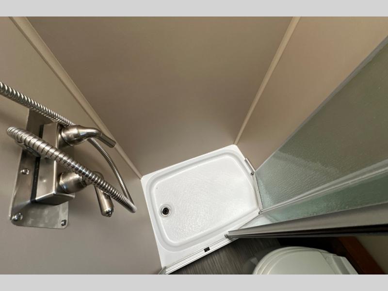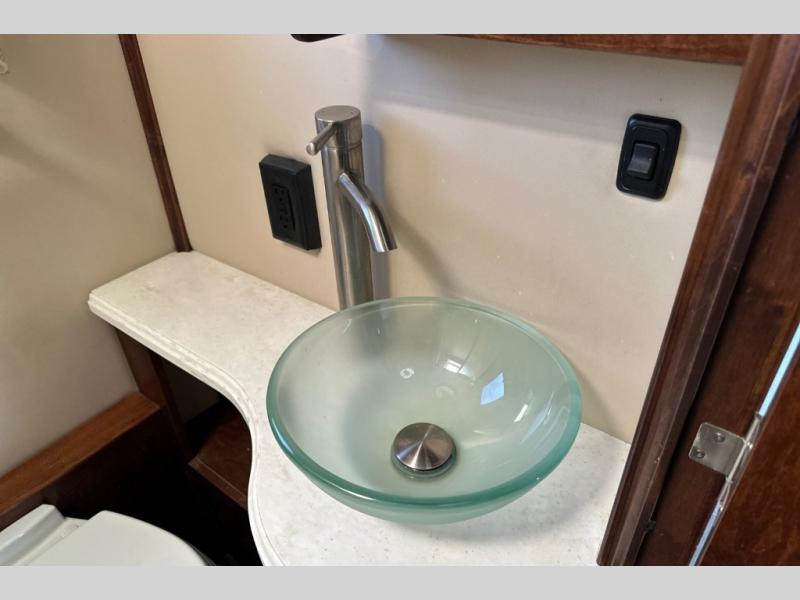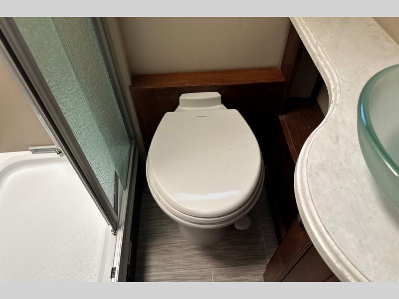 Mid-coach along the road side find a complete bath including a shower, toilet, and vanity with sink. This convenience alone makes it easy to be able to travel for an extended time.