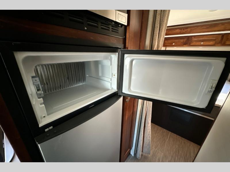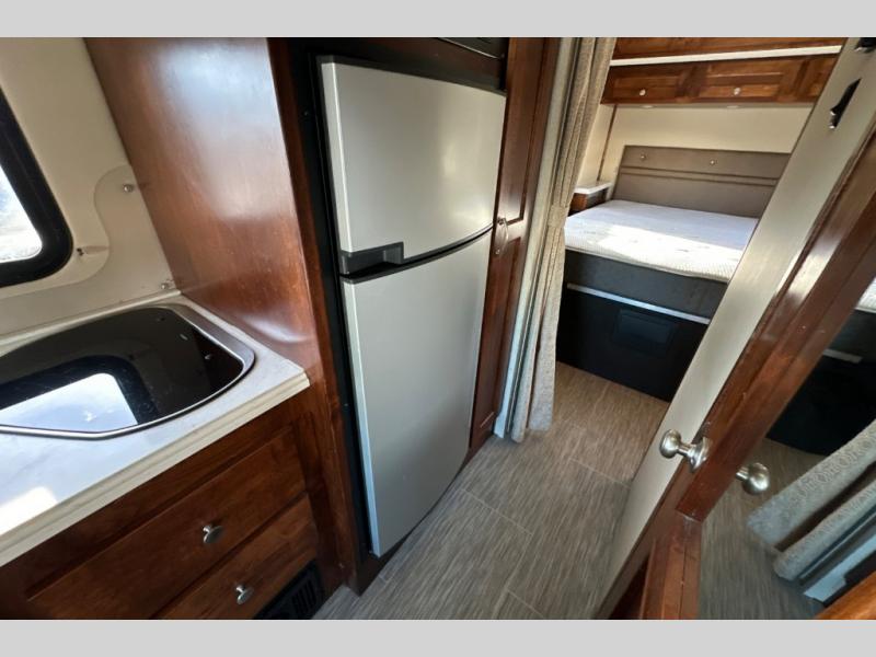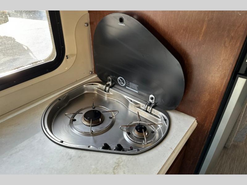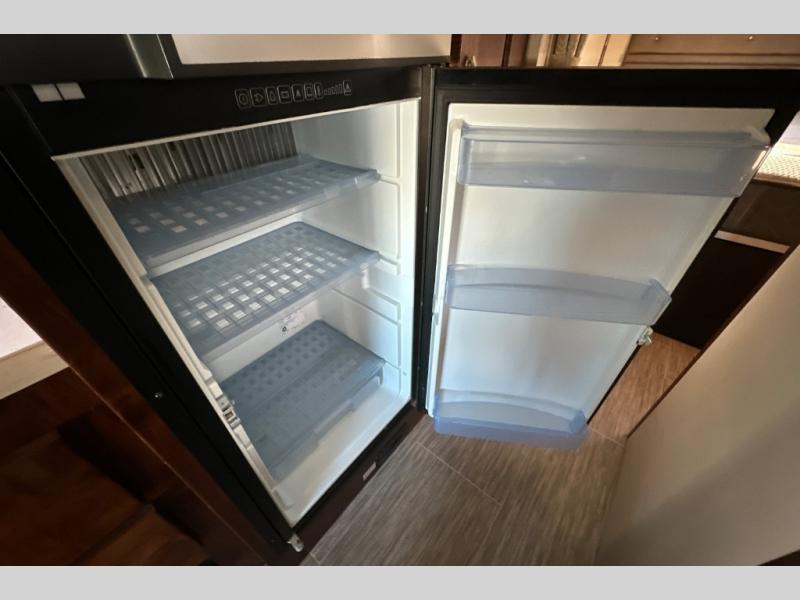 Step inside and enjoy a combined kitchen and living area. There is a round sink and two burner cook-top to the left of the door. Here you can easily cook and prepare food and snacks for your family. There is also a 7 cu. ft. refrigerator to keep your cold things cold.