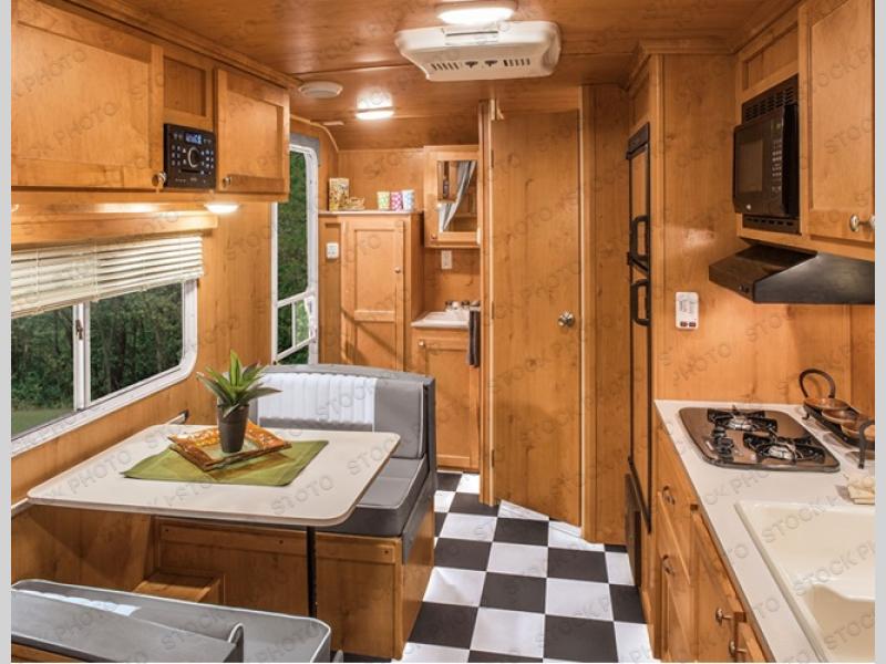 Everything you need to enjoy your time camping can be found in this Retro travel trailer model 180R by Riverside RV. This unit features a rear corner bath and a closet next to it where you can hang your clothes. There is plenty of space in the kitchen to prepare and cook your meals. You can also enjoy your meals at the booth dinette or convert it into an extra sleeping space at night. After a long day of fun, you can jump into the queen bed and enjoy a good night's rest.