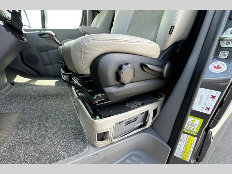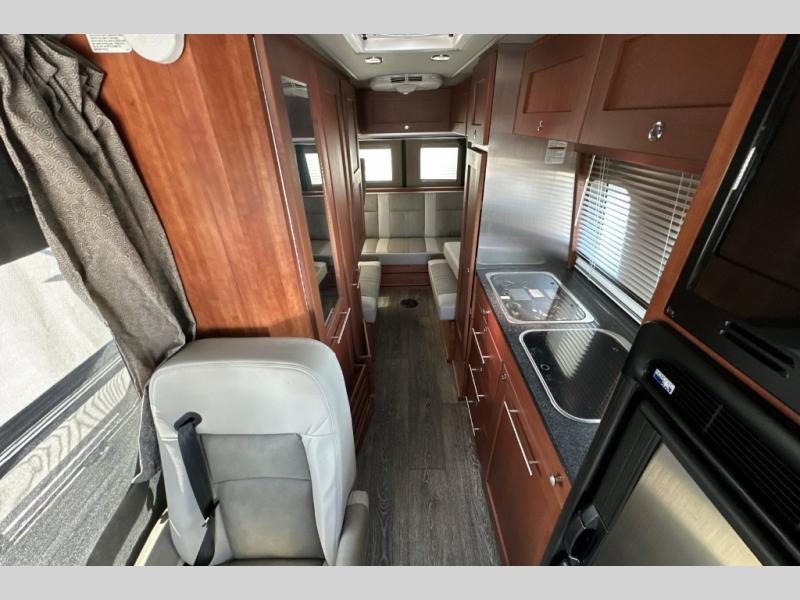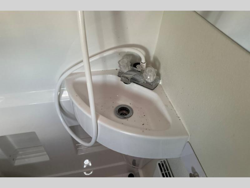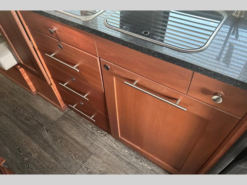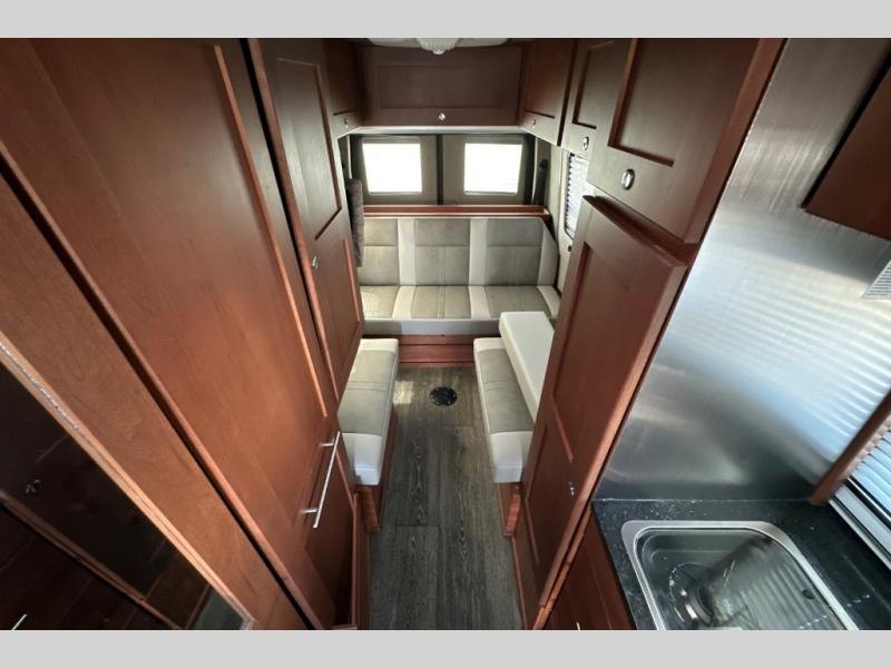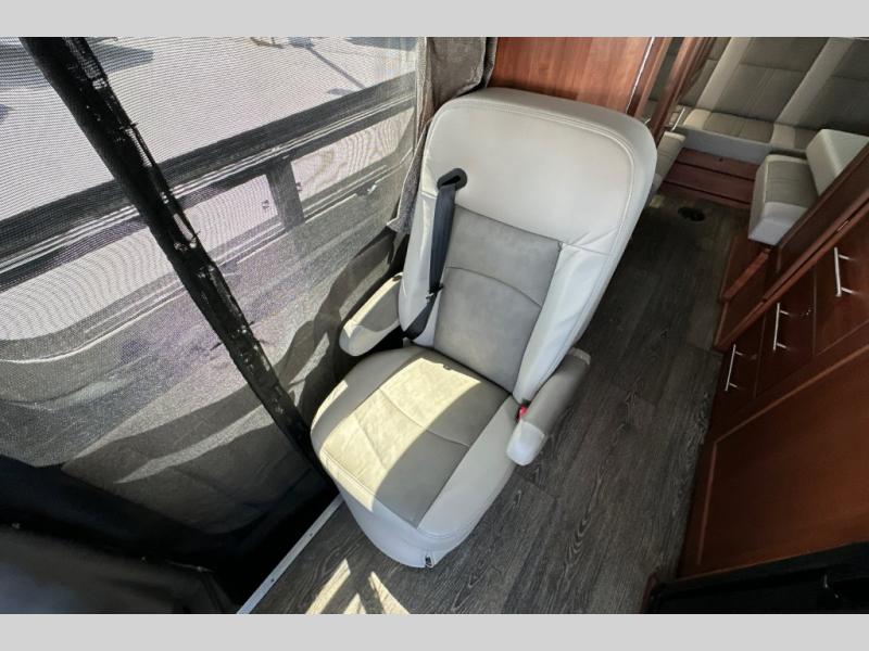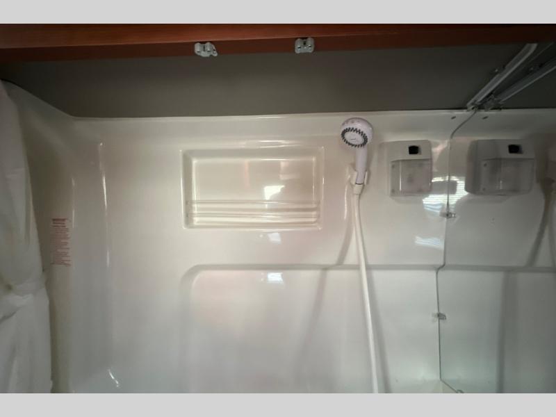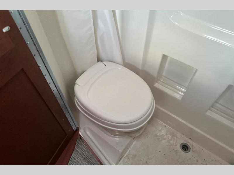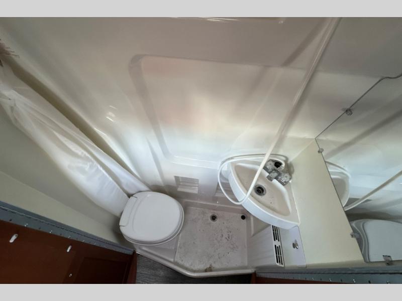The front offers three comfortable swivel captain's chairs with a table. The passenger side chairs can be converted to additional sleeping. A toilet, sink and shower are enclosed along the passenger side. Continuing to the back there is a wardrobe.