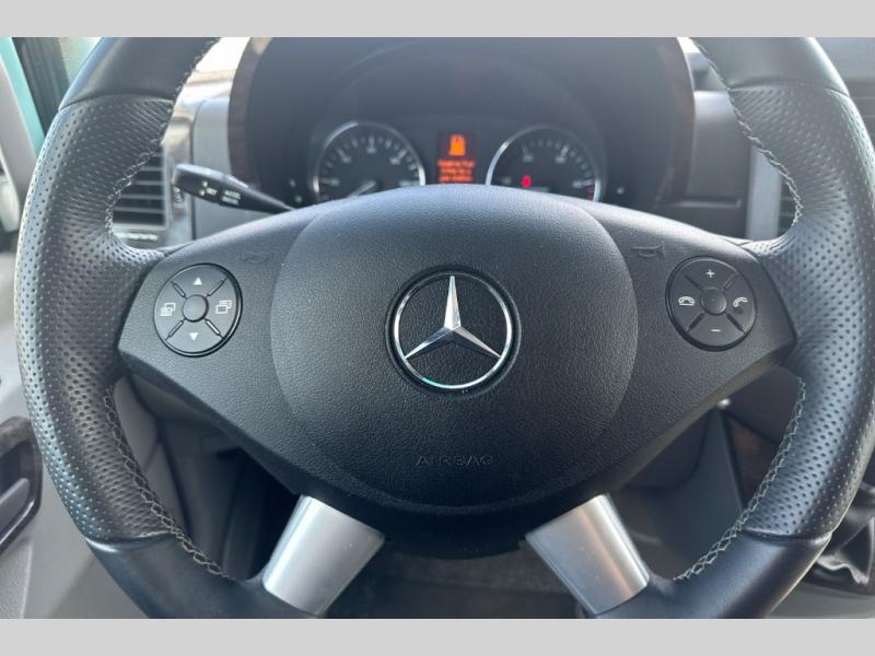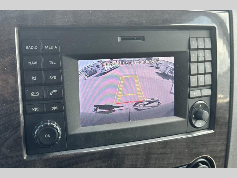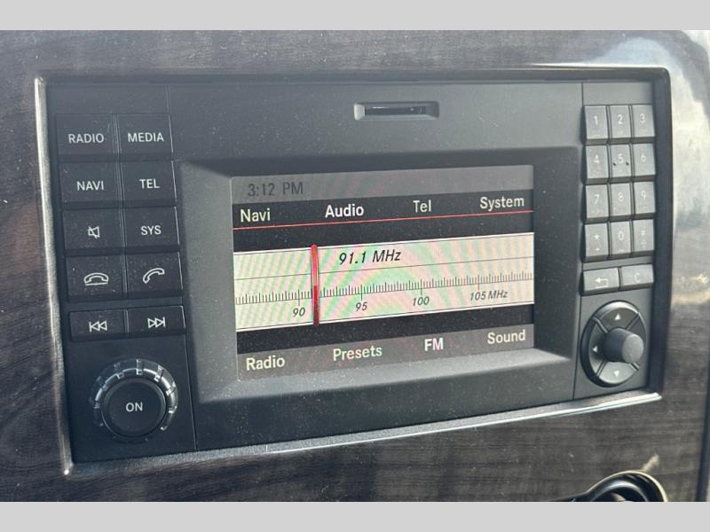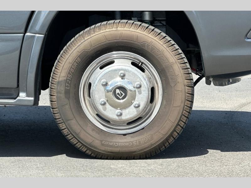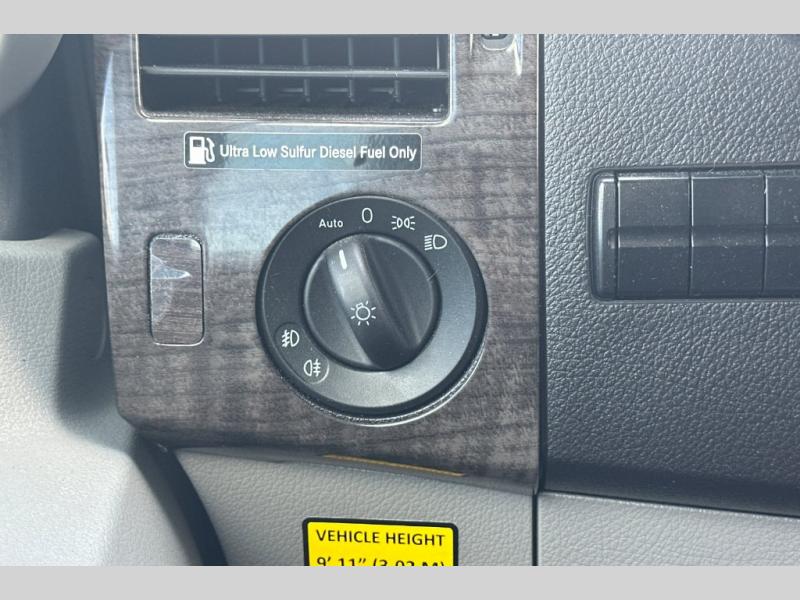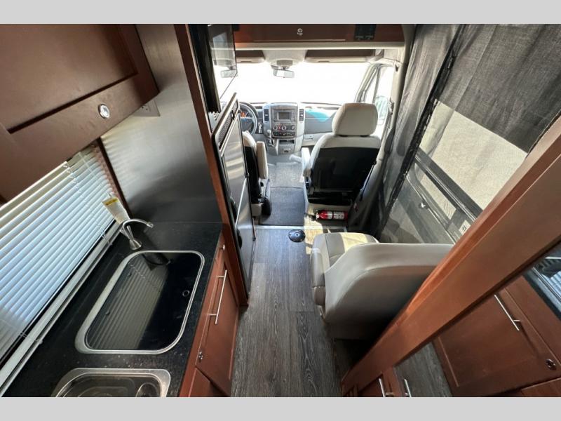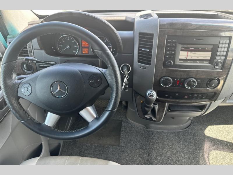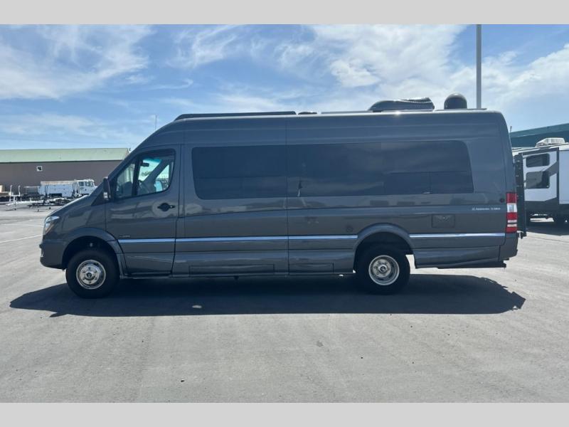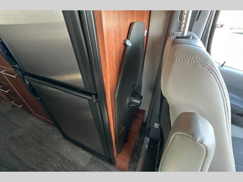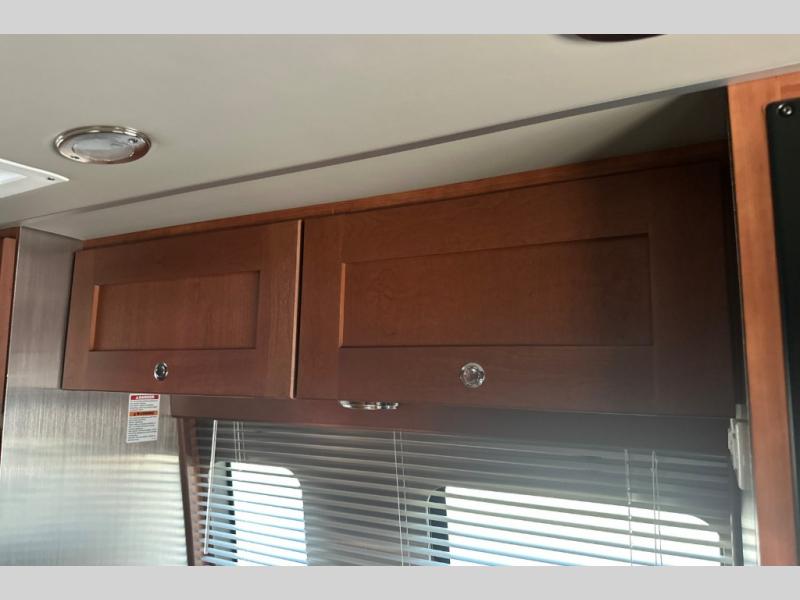 The front offers three comfortable swivel captain's chairs with a table. The passenger side chairs can be converted to additional sleeping. A toilet, sink and shower are enclosed along the passenger side. Continuing to the back there is a wardrobe.