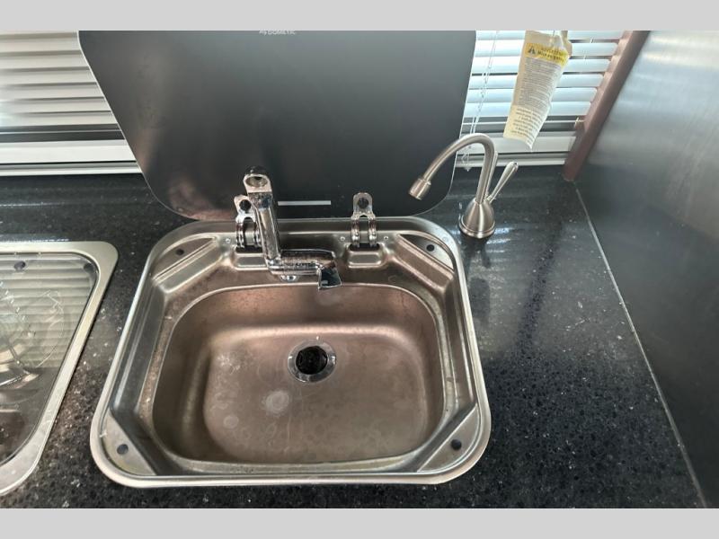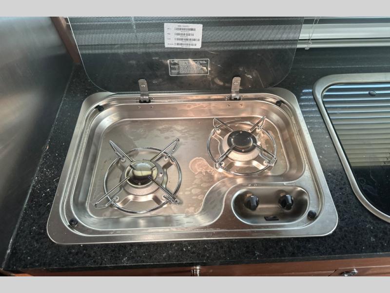 On the opposite side, you will find a two burner stove top as well as a sink, refrigerator and microwave with plenty of storage and more!