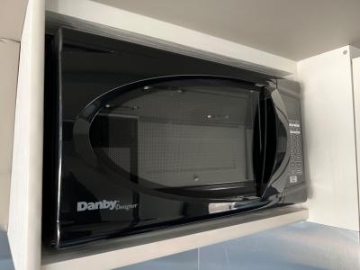 As you are in the motor home, you will find along the passenger side a sink, microwave, and propane stove. Across from the stove there is a refrigerator.