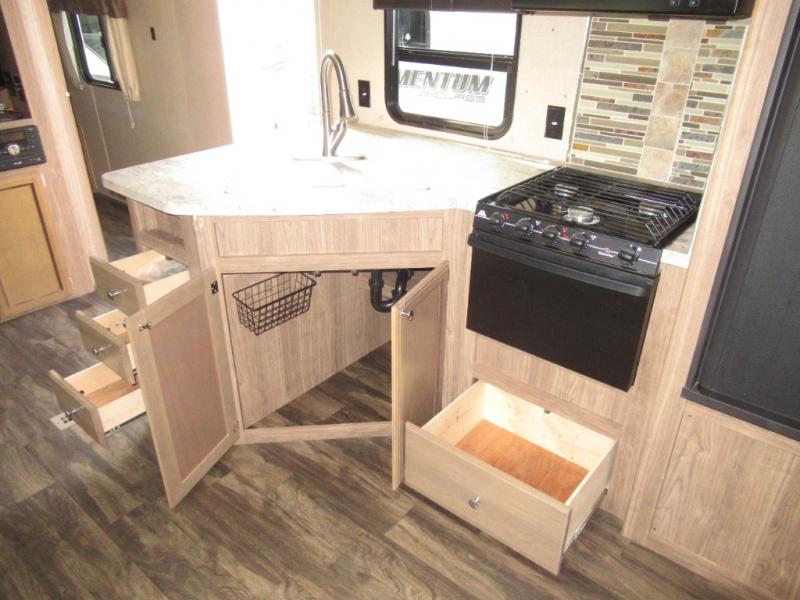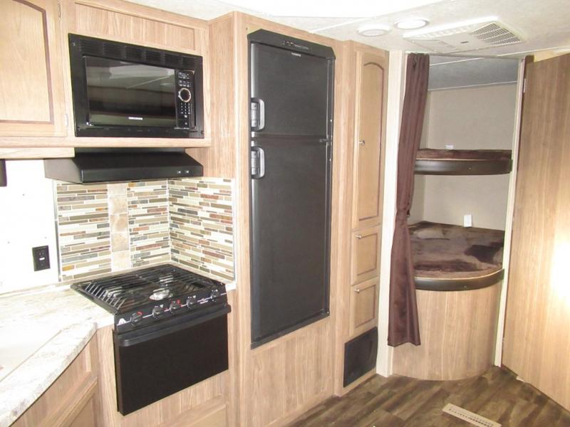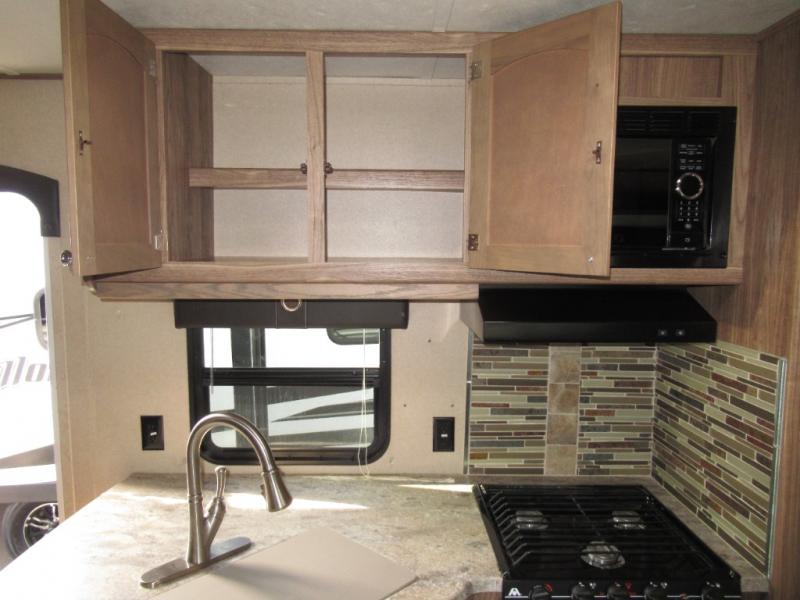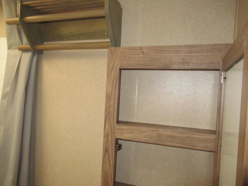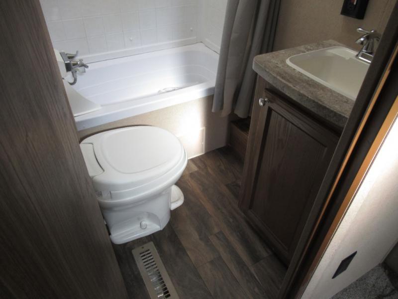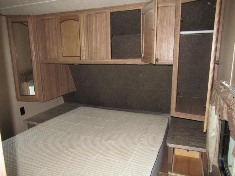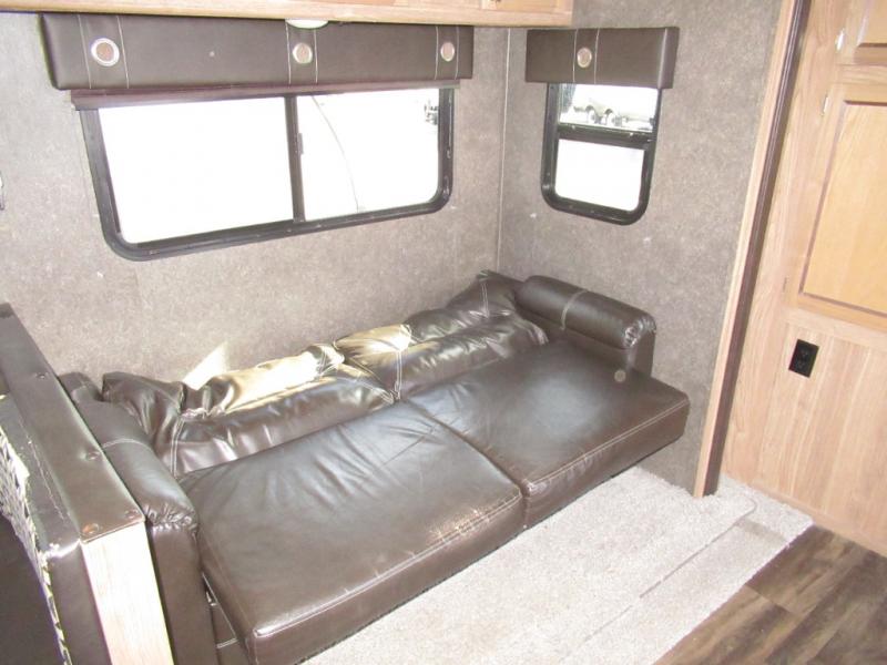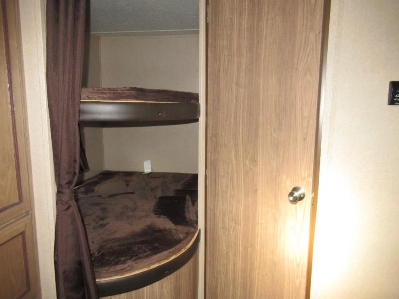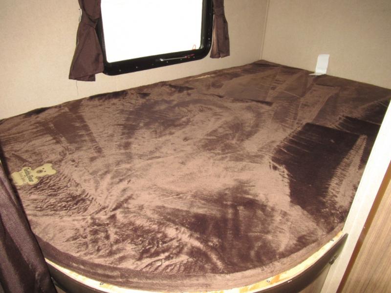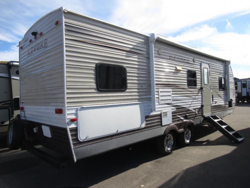 This Revere travel trailer can adequately accommodate you and your family as you tour the country because of the extra sleeping space with the addition of double bunks and a U-shaped booth dinette that turns into a bed. The front of this trailer houses a private bedroom for those travelers that need a little extra privacy while on the road, and the shower skylight adds a bit of cheeriness to the bathroom as you get ready in the morning.