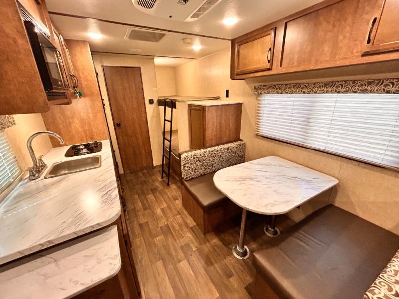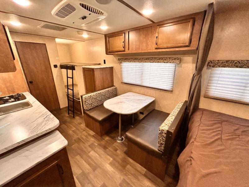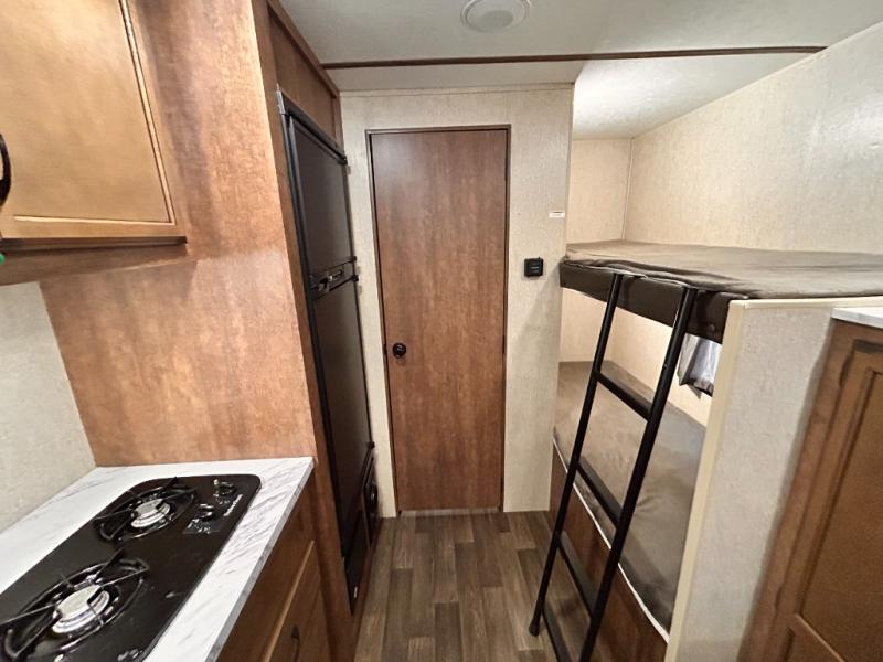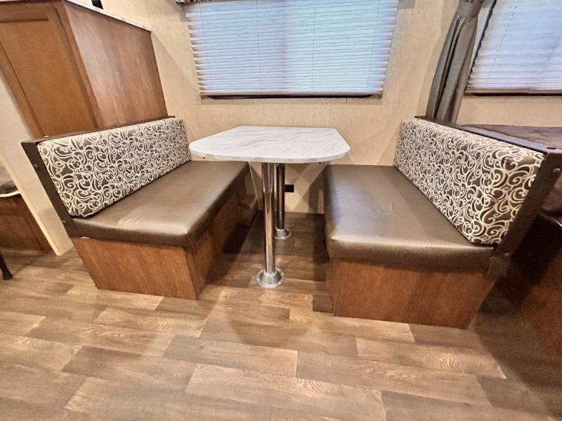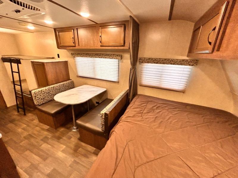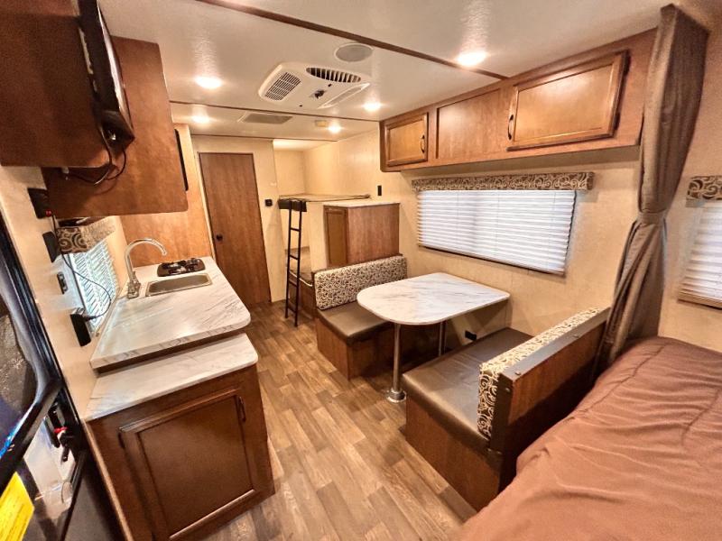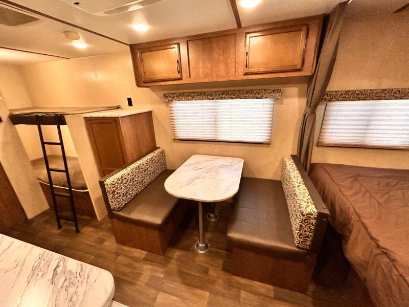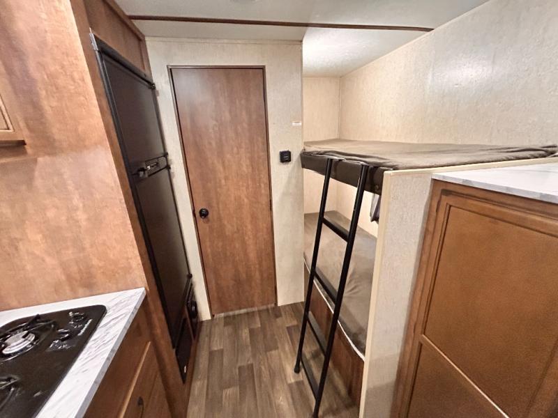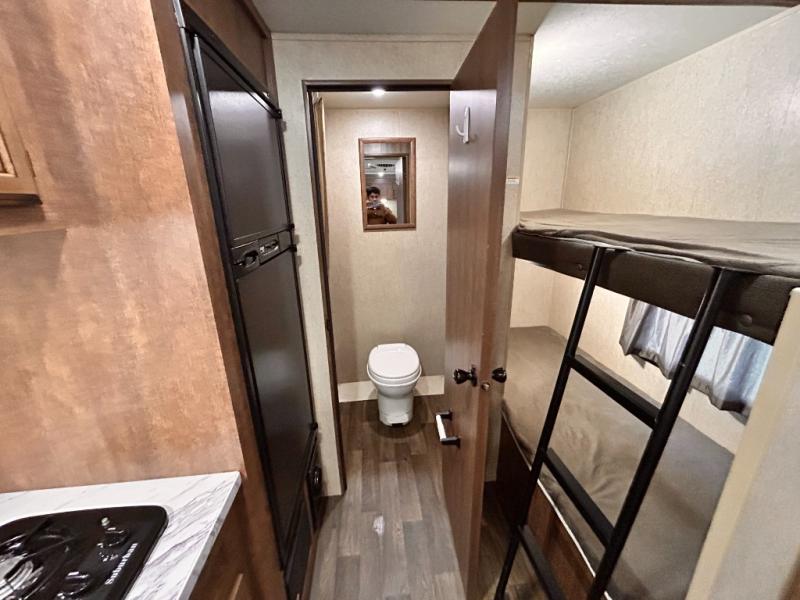You are going to love the functionality and convenience of this 20BH Autumn Ridge Outfitter travel trailer! With a rear set of bunk beds for your kids, a front queen bed for mom and dad, and a dinette which can easily convert into additional sleeping space you can accommodate a family of six. The rear bathroom has a tub/shower and a toilet for your convenience. Between the bunk beds and the dinette there is a large pantry for all of your canned goods.